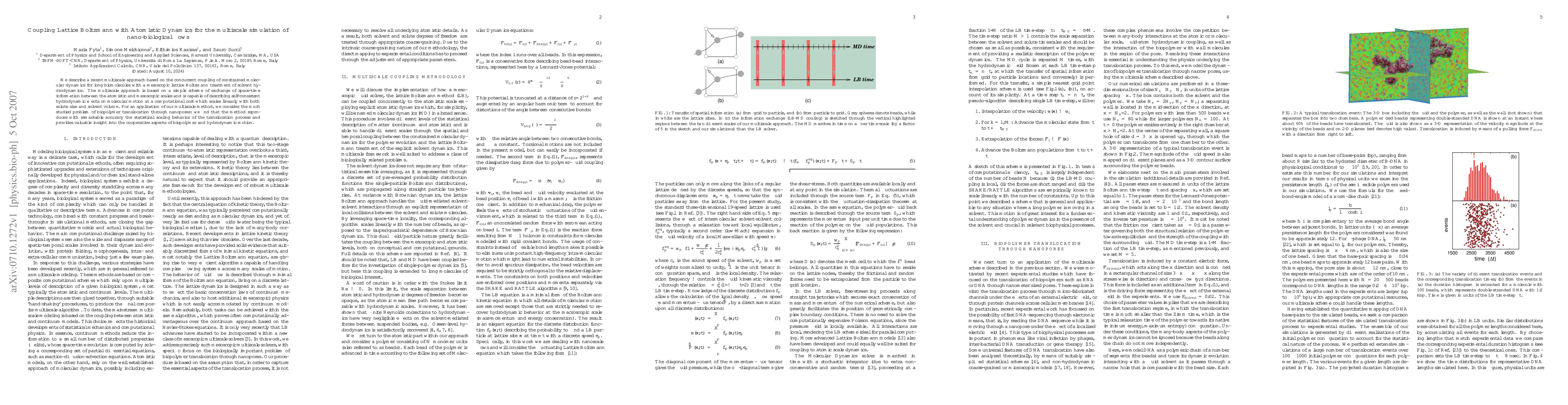 This paper presents a multiscale simulation method that combines constrained molecular dynamics for biomolecules with lattice Boltzmann methods for fluid dynamics, enabling accurate and efficient modeling of nano-biological flows. The method accurately reproduces biopolymer translocation through nanopores, providing insights into hydrodynamic effects on molecular motion.