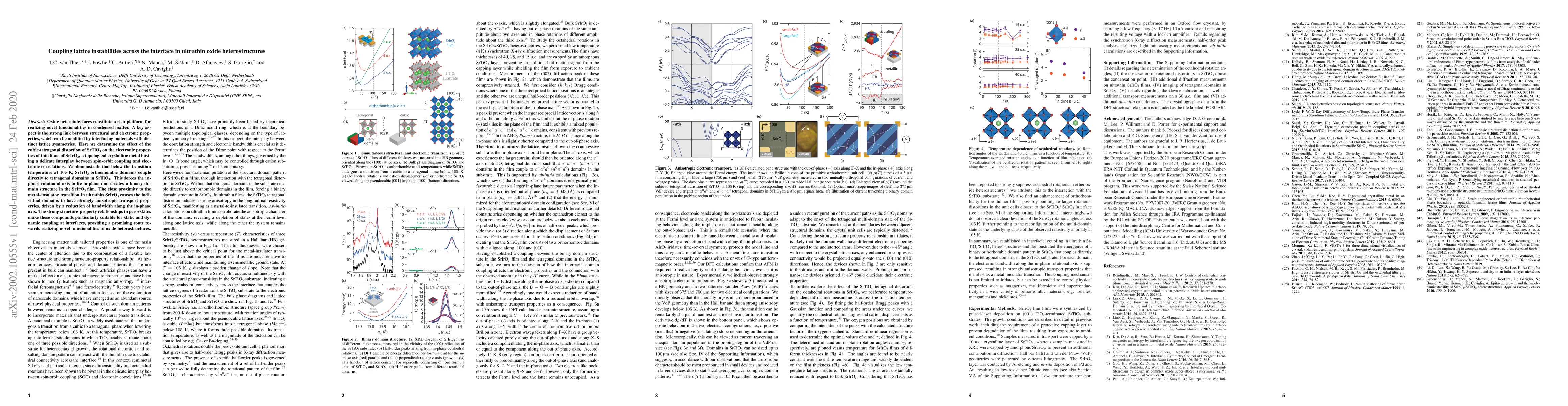 This research demonstrates that the lattice distortion of SrTiO3 influences the electronic properties of SrIrO3, leading to a binary domain structure in the SrIrO3 film below 105K. The close proximity to the metal-insulator transition in ultrathin SrIrO3 results in anisotropic transport properties due to reduced bandwidth along the in-plane axis, highlighting strong structure-property relationships in perovskites for novel oxide heterostructure functionalities.