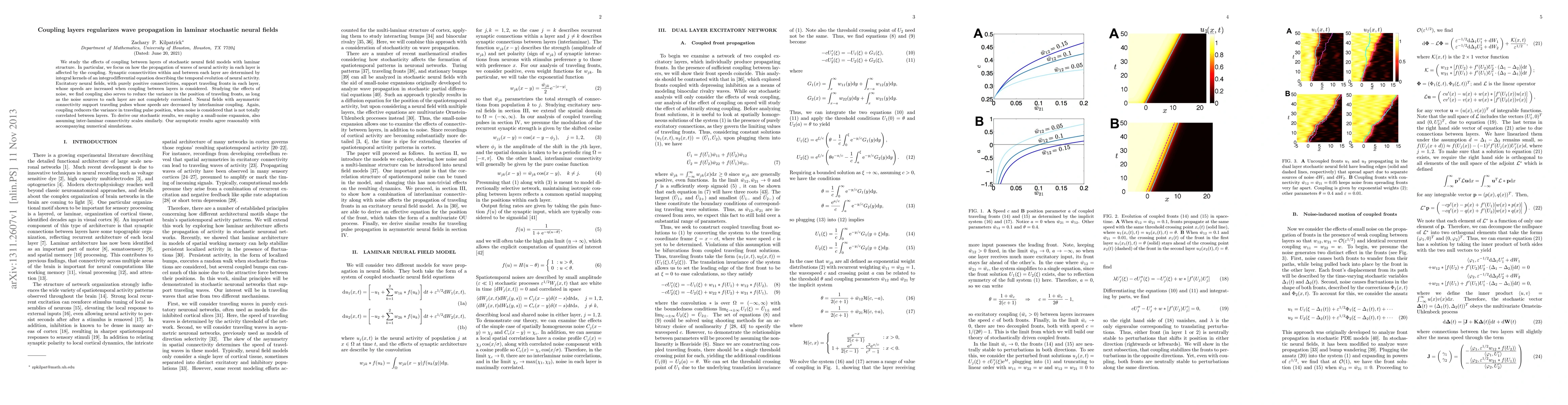 This research examines how inter-layer coupling influences wave propagation in stochastic neural fields with a laminar structure. Coupling enhances wave front speeds and reduces variance in front positions, especially when noise sources between layers are not perfectly correlated. Analytical and numerical results align well.