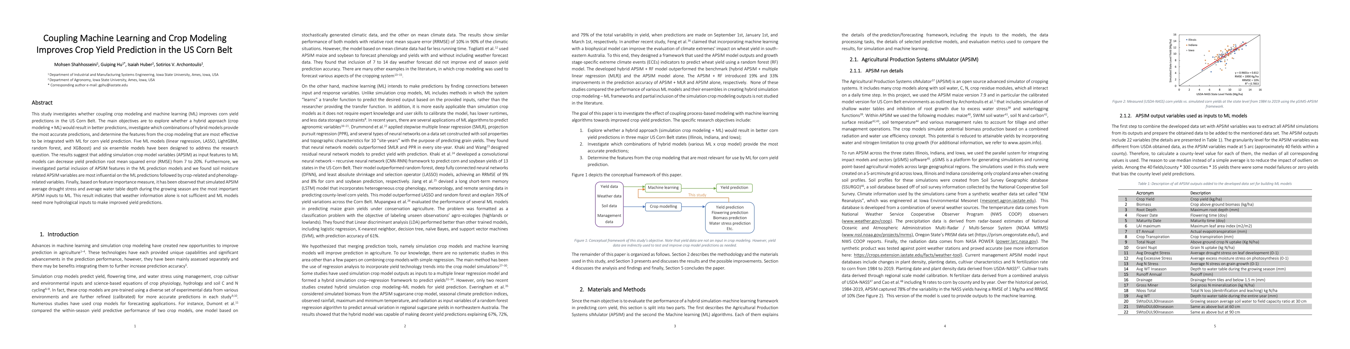 This study finds that integrating crop modeling with machine learning significantly improves corn yield predictions in the US Corn Belt, reducing RMSE by 7-20%. Soil moisture-related variables from the APSIM model are most influential, highlighting the importance of hydrological inputs beyond weather data alone.
