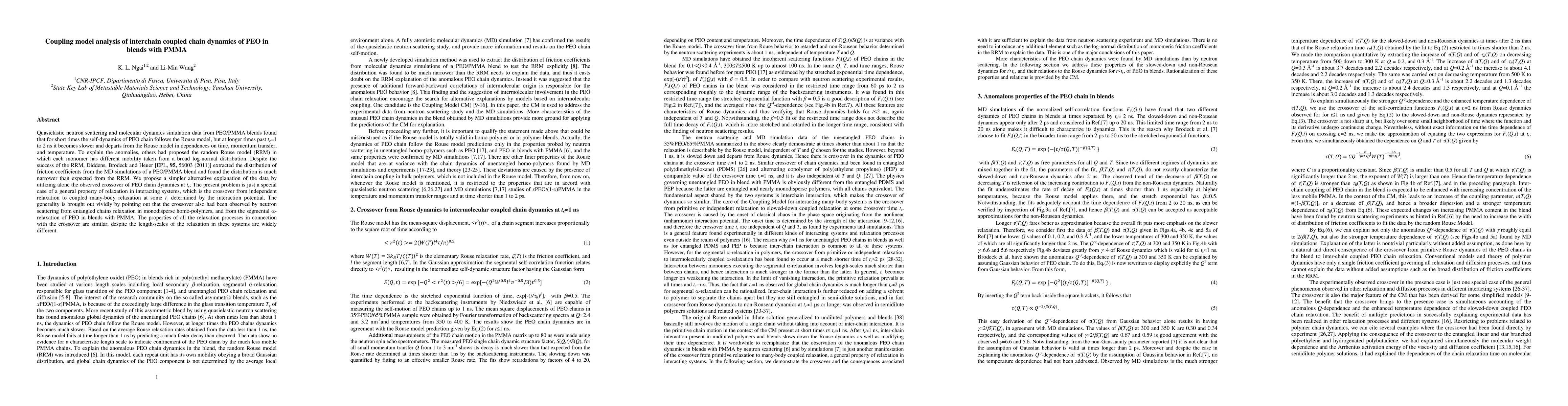 Quasielastic neutron scattering and molecular dynamics simulation data from PEO/PMMA blends found that for short times the self-dynamics of PEO chain follows the Rouse model, but at longer times past tc=1 to 2 ns it becomes slower and departs from the Rouse model in dependences on time, momentum transfer, and temperature. To explain the anomalies, others had proposed the random Rouse model (RRM) in which each monomer has different mobility taken from a broad log-normal distribution. Despite the success of the RRM, Diddens, Brodeck and Heuer [EPL, 95, 56003 (2011)] extracted the distribution of friction coefficients from the MD simulations of a PEO/PMMA blend and found the distribution is much narrower than expected from the RRM. We propose a simpler alternative explanation of the data by utilizing alone the observed crossover of PEO chain dynamics at tc. The present problem is just a special case of a general property of relaxation in interacting systems, which is the crossover from independent relaxation to coupled many-body relaxation at some tc determined by the interaction potential. The generality is brought out vividly by pointing out that the crossover also had been observed by neutron scattering from entangled chains relaxation in monodisperse homo-polymers, and from the segmental \alpha-relaxation of PEO in blends with PMMA. The properties of all the relaxation processes in connection with the crossover are similar, despite the length-scales of the relaxation in these systems are widely different.
