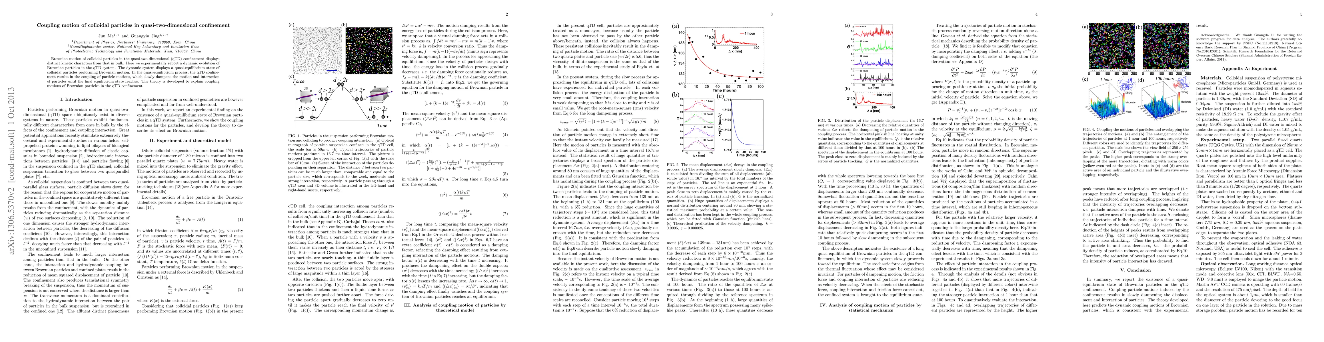 Brownian motion of colloidal particles in the quasi-two-dimensional (qTD) confinement displays distinct kinetic characters from that in bulk. Here we experimentally report a dynamic evolution of Brownian particles in the qTD system. The dynamic system displays a quasi-equilibrium state of colloidal particles performing Brownian motion. In the quasi-equilibrium process, the qTD confinement results in the coupling of particle motions, which slowly dampens the motion and interaction of particles until the final equilibrium state reaches. The theory is developed to explain coupling motions of Brownian particles in the qTD confinement.