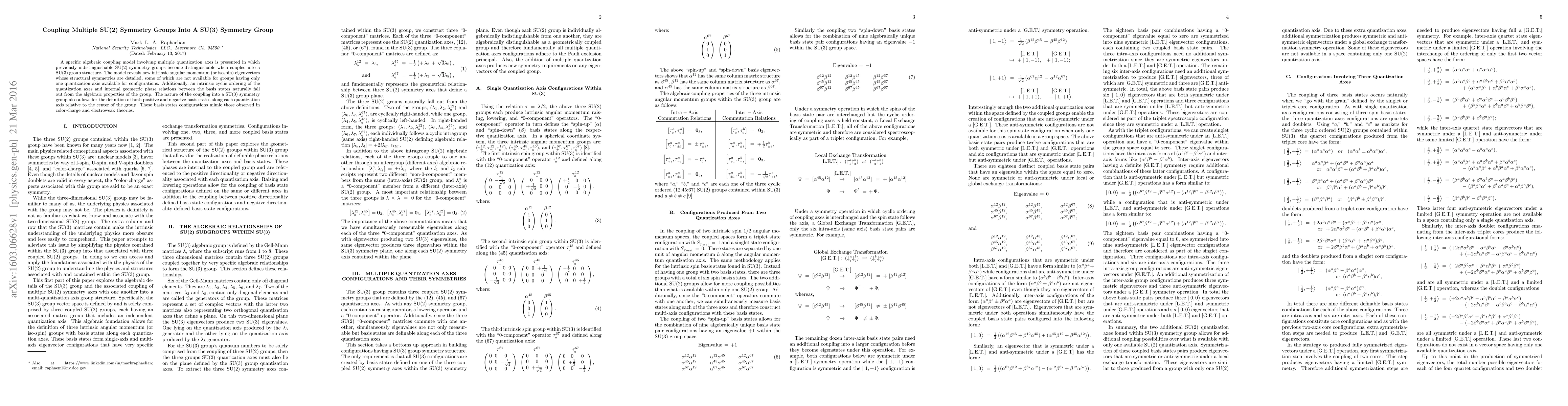 A specific algebraic coupling model involving multiple quantization axes is presented in which previously indistinguishable SU(2) symmetry groups become distinguishable when coupled into a SU(3) group structure. The model reveals new intrinsic angular momentum (or isospin) eigenvectors whose structural symmetries are detailed, some of which are not available for groups having only one quantization axis available for configurations. Additionally, an intrinsic cyclic ordering of the quantization axes and internal geometric phase relations between the basis states naturally fall out from the algebraic properties of the group. The nature of the coupling into a SU(3) symmetry group also allows for the definition of both positive and negative basis states along each quantization axis relative to the center of the group. These basis states configurations mimic those observed in color-charge and electroweak theories.