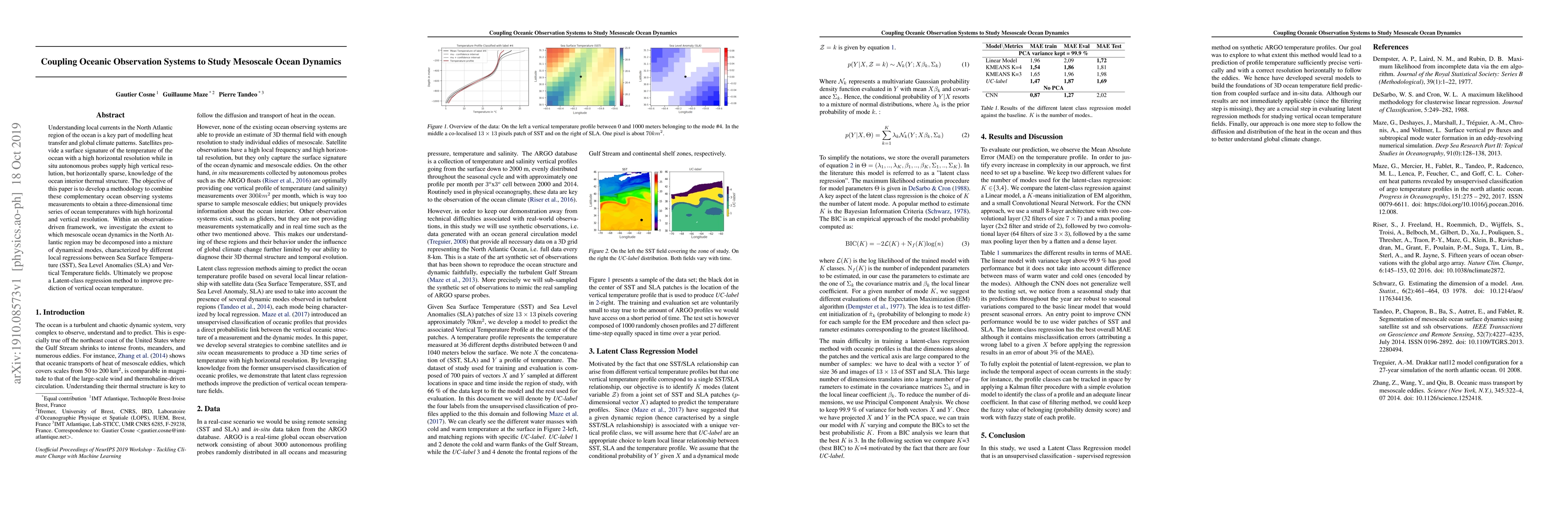 Understanding local currents in the North Atlantic region of the ocean is a key part of modelling heat transfer and global climate patterns. Satellites provide a surface signature of the temperature of the ocean with a high horizontal resolution while in situ autonomous probes supply high vertical resolution, but horizontally sparse, knowledge of the ocean interior thermal structure. The objective of this paper is to develop a methodology to combine these complementary ocean observing systems measurements to obtain a three-dimensional time series of ocean temperatures with high horizontal and vertical resolution. Within an observation-driven framework, we investigate the extent to which mesoscale ocean dynamics in the North Atlantic region may be decomposed into a mixture of dynamical modes, characterized by different local regressions between Sea Surface Temperature (SST), Sea Level Anomalies (SLA) and Vertical Temperature fields. Ultimately we propose a Latent-class regression method to improve prediction of vertical ocean temperature.