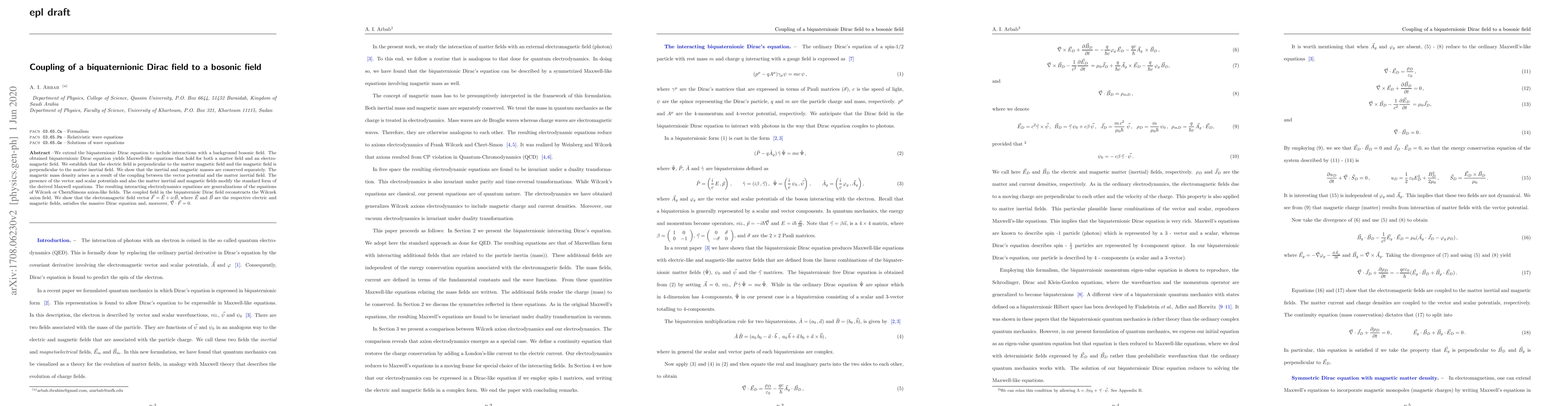 This research extends the biquaternionic Dirac equation to incorporate interactions with a bosonic field, generating Maxwell-like equations applicable to both matter and electromagnetic fields. These equations generalize Wilczek field equations.