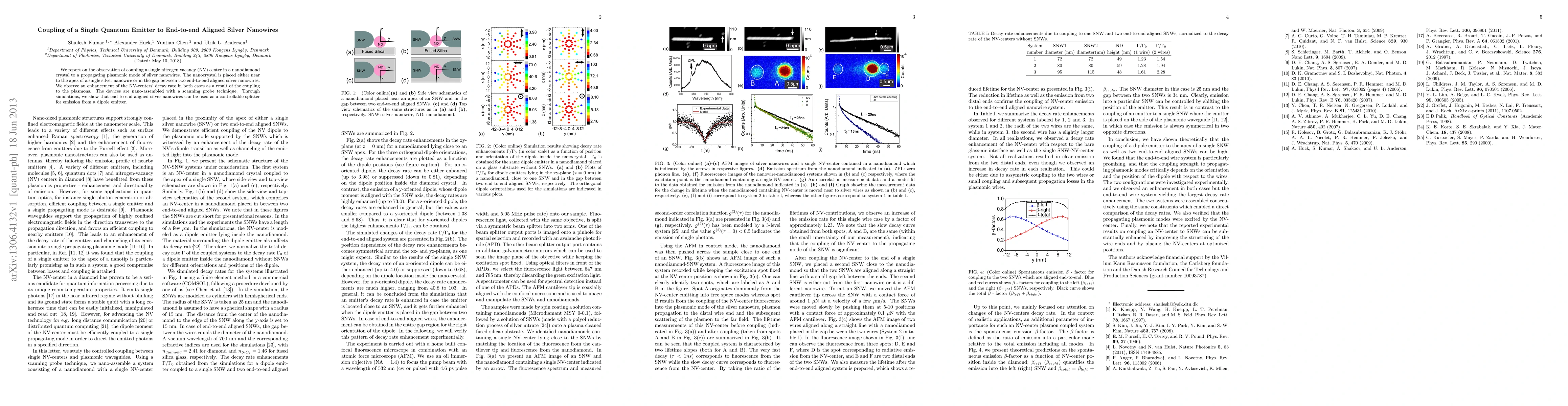 This research demonstrates the coupling of a single nitrogen vacancy center in a nanodiamond to plasmonic modes in silver nanowires, showing enhanced decay rates due to plasmonic interaction. The study also reveals that end-to-end aligned silver nanowires can function as a controllable splitter for dipole emitters, as shown through simulations.
