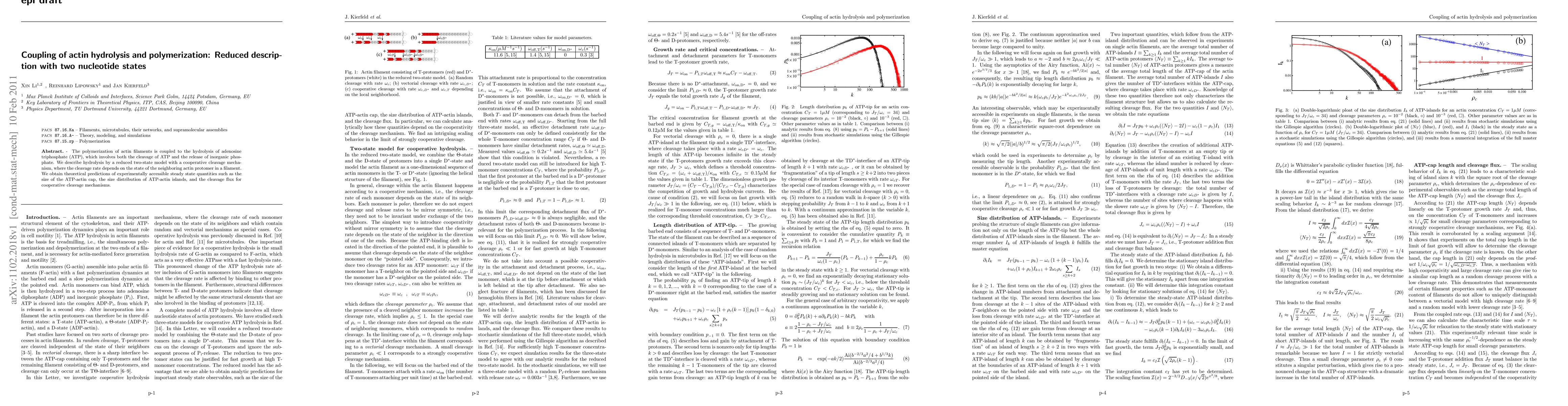 This paper proposes a two-state model to describe the coupling between actin polymerization and ATP hydrolysis, emphasizing cooperative cleavage mechanisms influenced by neighboring actin protomers. Theoretical predictions include steady-state quantities like ATP-actin cap size and ATP-actin island distribution.