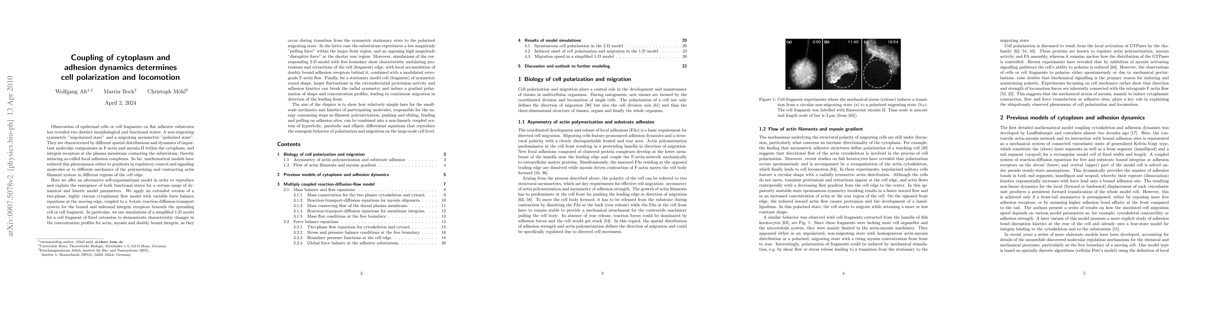 Observations of single epidermal cells on flat adhesive substrates have revealed two distinct morphological and functional states, namely a non-migrating symmetric unpolarized state and a migrating asymmetric polarized state. These states are characterized by different spatial distributions and dynamics of important biochemical cell components: F-actin and myosin-II form the contractile part of the cytoskeleton, and integrin receptors in the plasma membrane connect F-actin filaments to the substratum. In this way, focal adhesion complexes are assembled, which determine cytoskeletal force transduction and subsequent cell locomotion. So far, physical models have reduced this phenomenon either to gradients in regulatory control molecules or to different mechanics of the actin filament system in different regions of the cell. Here we offer an alternative and self-organizational model incorporating polymerization, pushing and sliding of filaments, as well as formation of adhesion sites and their force dependent kinetics. All these phenomena can be combined into a non-linearly coupled system of hyperbolic, parabolic and elliptic differential equations. Aim of this article is to show how relatively simple relations for the small-scale mechanics and kinetics of participating molecules may reproduce the emergent behavior of polarization and migration on the large-scale cell level.
