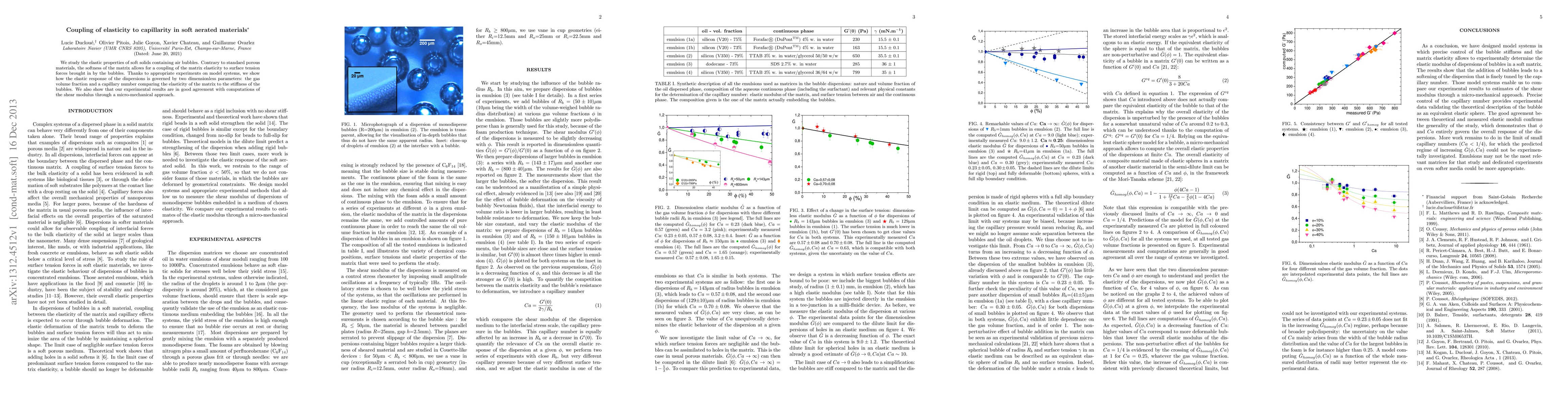 This paper investigates the elastic properties of soft solids with air bubbles, revealing a unique coupling between matrix elasticity and surface tension forces due to the bubbles. Experimental and computational results show that the elastic response is governed by gas volume fraction and a capillary number, aligning well with micro-mechanical models.