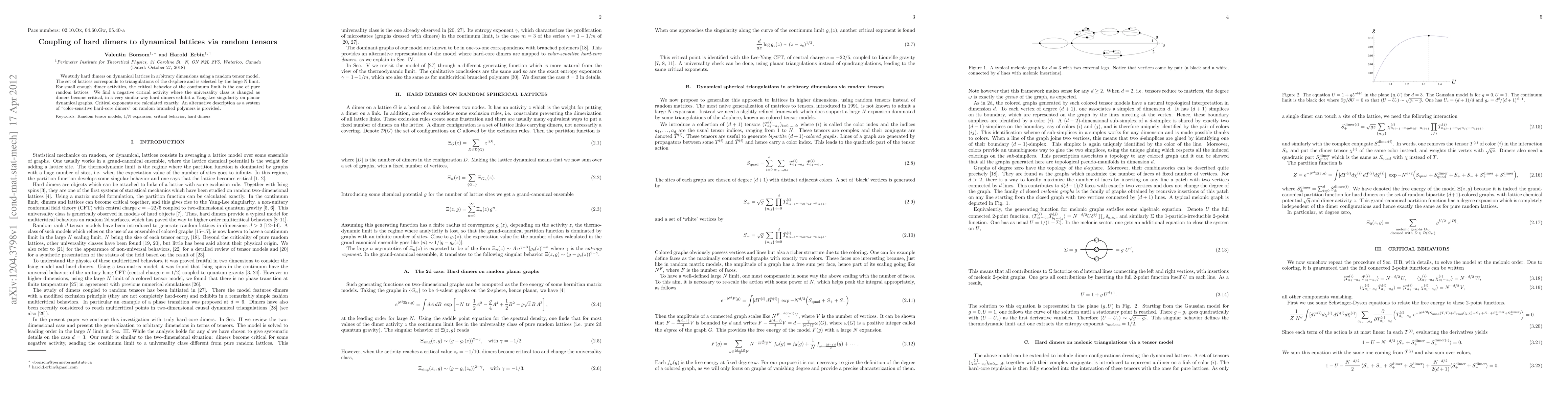 This paper investigates hard dimers on dynamical lattices using a random tensor model, finding a critical activity where the universality class changes, akin to the Yang-Lee singularity in planar graphs. Critical exponents are calculated exactly, and the system is alternatively described as color-sensitive hard-core dimers on random branched polymers.