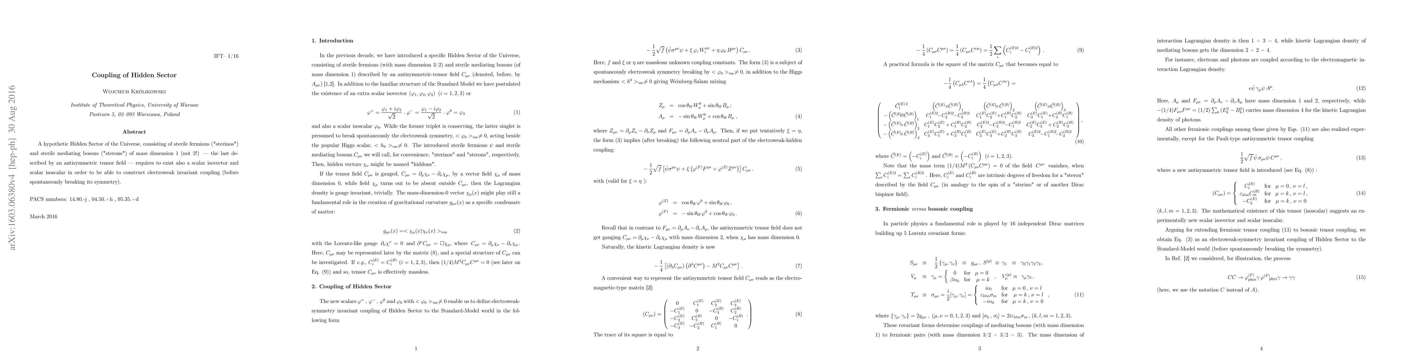 Researchers propose the existence of a Hidden Sector in the Universe, requiring new particles to construct electroweak invariant coupling, and introduce a scalar isovector and scalar isoscalar to facilitate this.