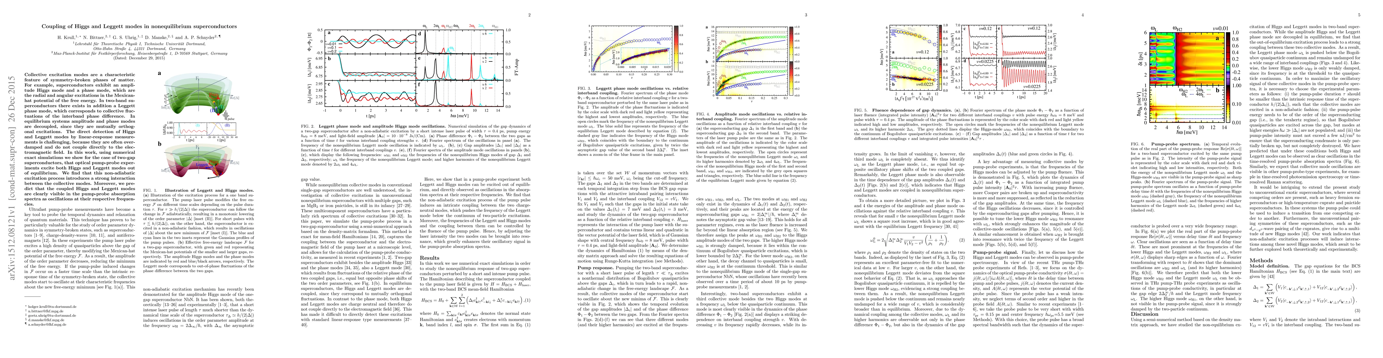 This paper demonstrates that optical pump-probe experiments can excite both Higgs and Leggett modes in nonequilibrium two-band superconductors, revealing a strong coupling between these modes due to the non-adiabatic excitation process. The study predicts that these coupled modes will manifest as oscillations in the pump-probe absorption spectra.