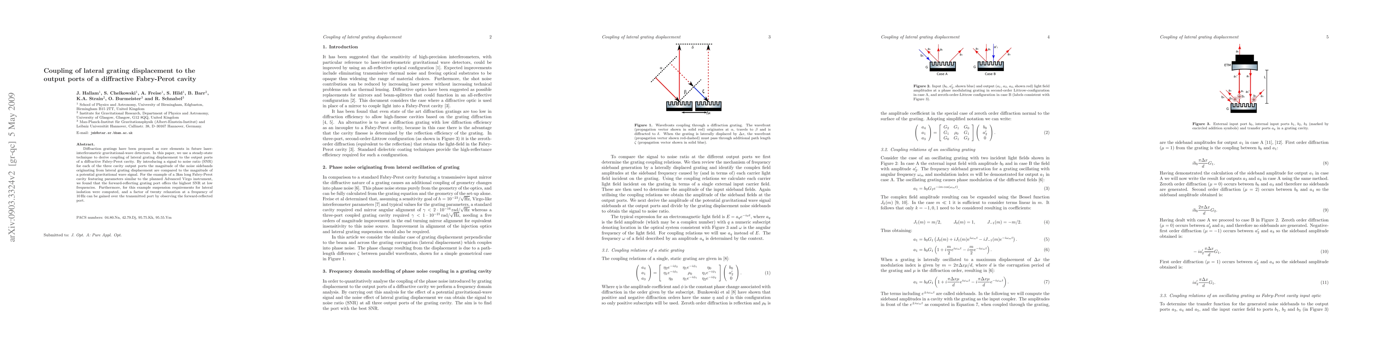 This paper investigates the coupling of lateral grating displacement to the output ports of a diffractive Fabry-Perot cavity, crucial for future laser-interferometric gravitational-wave detectors. It finds that the forward-reflecting port offers the highest signal-to-noise ratio, allowing for a twenty-fold reduction in suspension requirements for lateral isolation at 10Hz compared to the transmitted port.