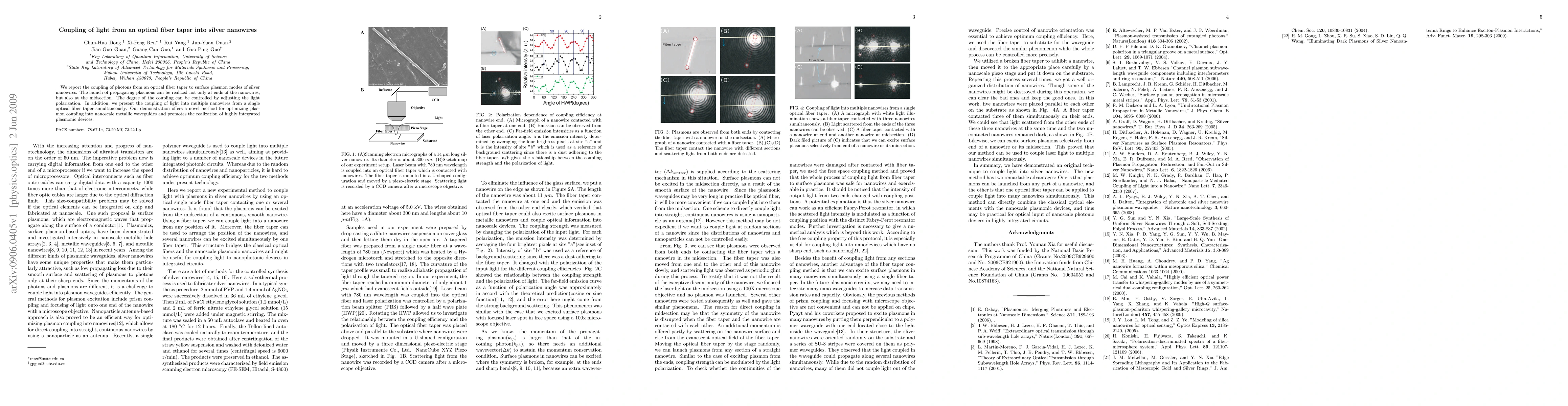 This paper demonstrates the efficient coupling of light from an optical fiber taper into surface plasmon modes of silver nanowires, showing that plasmons can be launched at both ends and midsection of the nanowires. The degree of coupling is tunable via light polarization, and multiple nanowires can be coupled simultaneously, offering a new method for optimizing plasmonic coupling and enhancing integrated plasmonic devices.