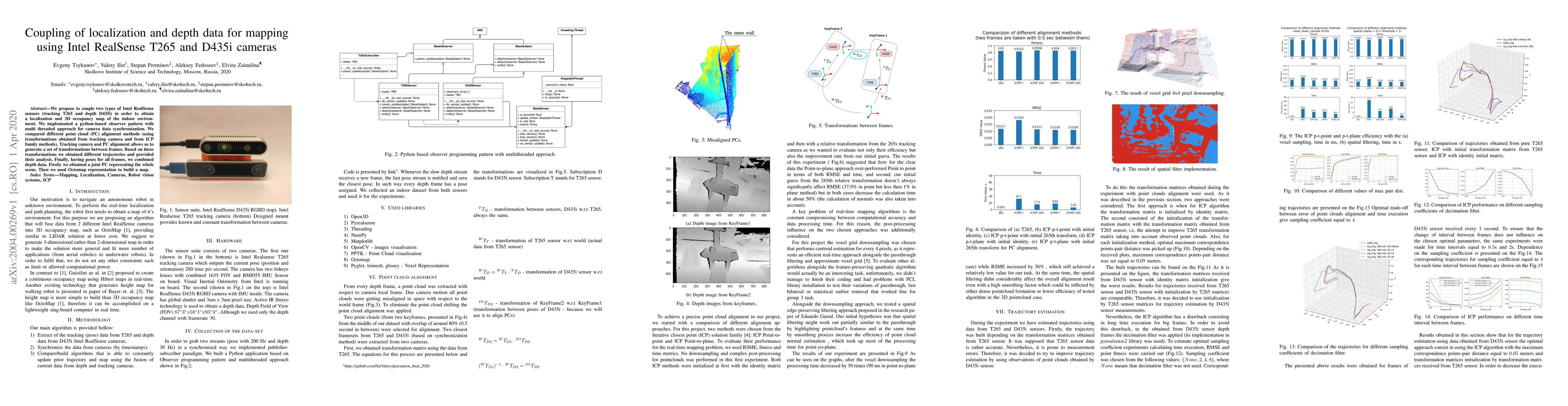We propose to couple two types of Intel RealSense sensors (tracking T265 and depth D435i) in order to obtain localization and 3D occupancy map of the indoor environment. We implemented a python-based observer pattern with multi-threaded approach for camera data synchronization. We compared different point cloud (PC) alignment methods (using transformations obtained from tracking camera and from ICP family methods). Tracking camera and PC alignment allow us to generate a set of transformations between frames. Based on these transformations we obtained different trajectories and provided their analysis. Finally, having poses for all frames, we combined depth data. Firstly we obtained a joint PC representing the whole scene. Then we used Octomap representation to build a map.