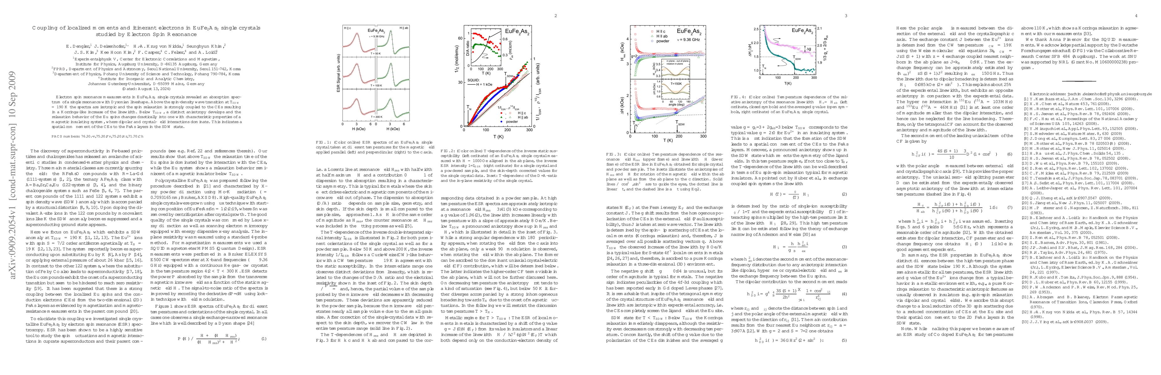 Electron Spin Resonance in EuFe2As2 single crystals shows a single resonance with Dysonian lineshape, indicating strong coupling between localized Eu moments and itinerant electrons above the spin-density wave transition. Below the transition, anisotropy develops, suggesting confinement of conduction electrons to FeAs layers.