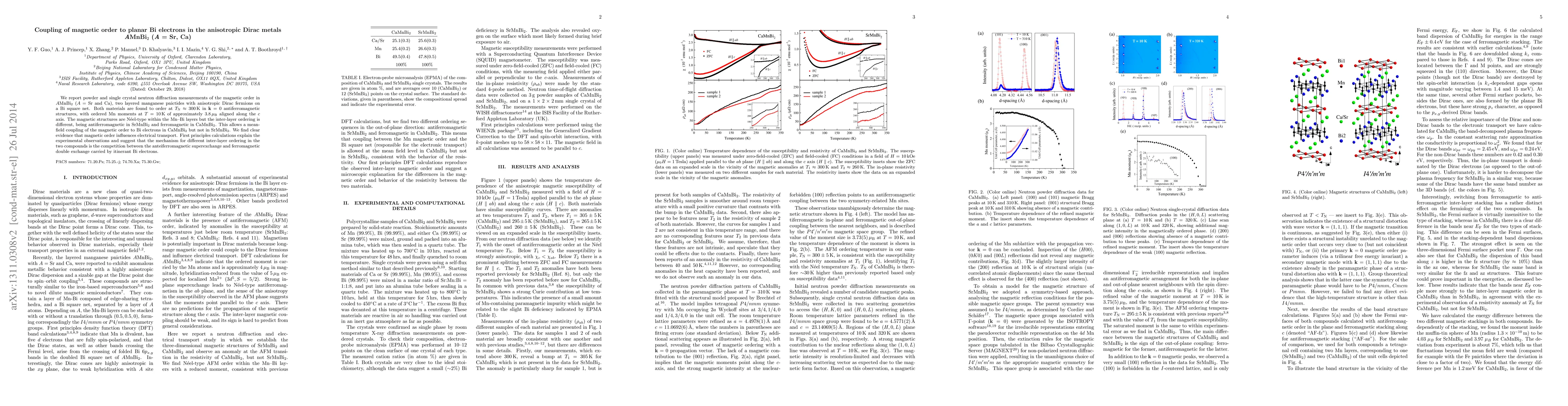 We report powder and single crystal neutron diffraction measurements of the magnetic order in AMnBi2 (A = Sr and Ca), two layered manganese pnictides with anisotropic Dirac fermions on a Bi square net. Both materials are found to order at TN approx 300 K in k = 0 antiferromagnetic structures, with ordered Mn moments at T = 10 K of approximately 3.8 muB aligned along the c axis. The magnetic structures are Neel-type within the Mn--Bi layers but the inter-layer ordering is different, being antiferromagnetic in SrMnBi2 and ferromagnetic in CaMnBi2. This allows a mean-field coupling of the magnetic order to Bi electrons in CaMnBi2 but not in SrMnBi2. We find clear evidence that magnetic order influences electrical transport. First principles calculations explain the experimental observations and suggest that the mechanism for different inter-layer ordering in the two compounds is the competition between the anteiferromagnetic superexchange and ferromagnetic double exchange carried by itinerant Bi electrons.