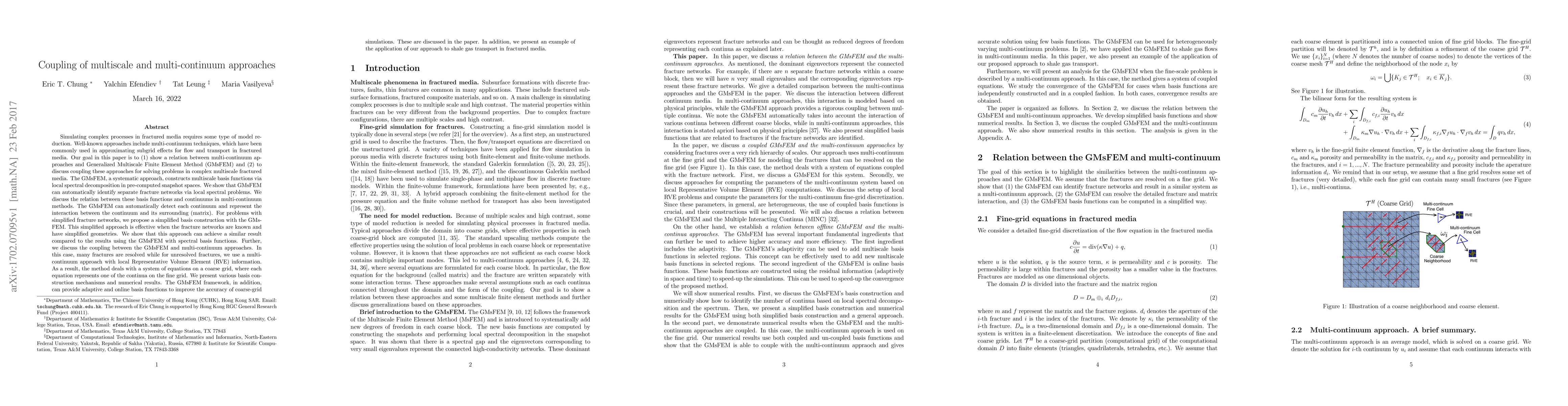 This paper explores the coupling of Generalized Multiscale Finite Element Method (GMsFEM) with multi-continuum approaches to simulate complex processes in fractured media. It demonstrates how GMsFEM can identify and represent fracture networks, and discusses the integration of GMsFEM with multi-continuum methods for efficient multiscale problem solving.