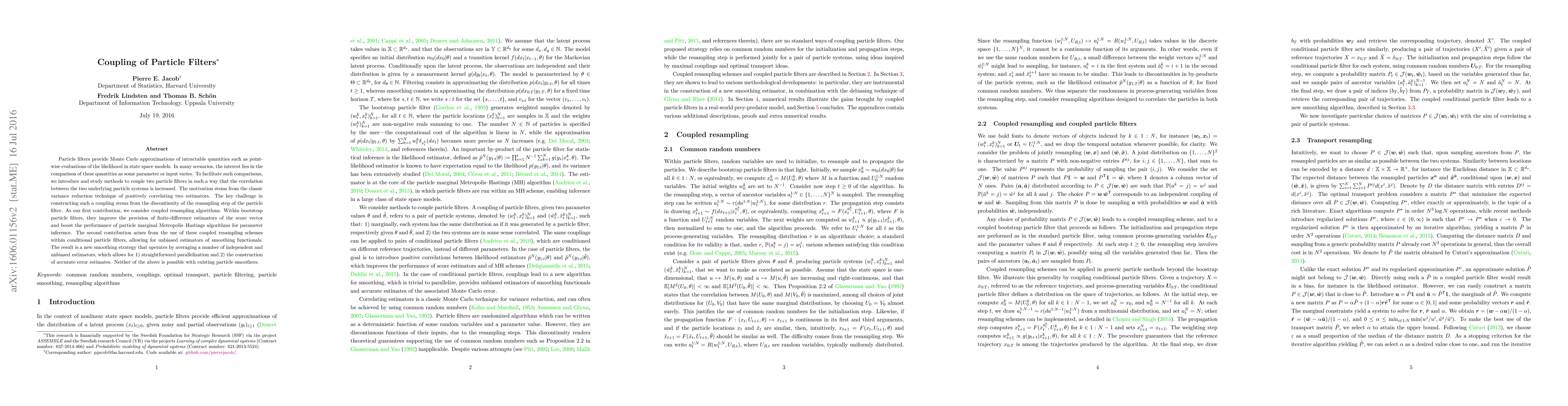 This paper introduces methods to couple two particle filters to enhance the correlation between their underlying particle systems, aiming to improve the precision of estimators and performance of parameter inference algorithms. The proposed coupled resampling algorithms enable parallelization and accurate error estimation in smoothing strategies, surpassing the capabilities of existing particle smoothers.