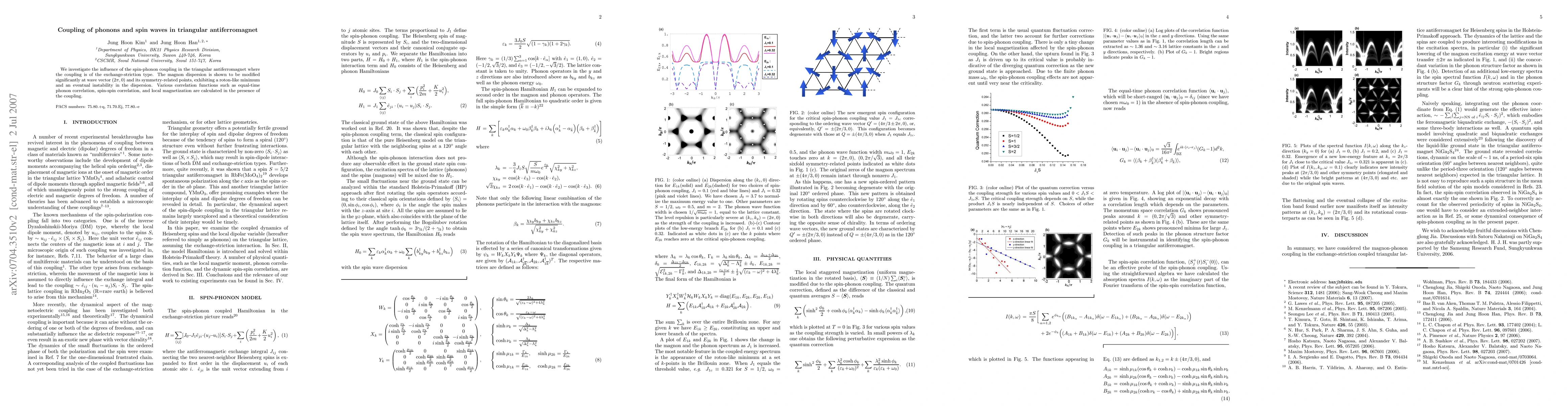 This study explores the impact of exchange-striction mediated spin-phonon coupling in triangular antiferromagnets, revealing significant modifications in the magnon dispersion, including a roton-like minimum and instability at specific wave vectors. Calculations of various correlation functions highlight the effects of this coupling on phonons, spin correlations, and local magnetization.