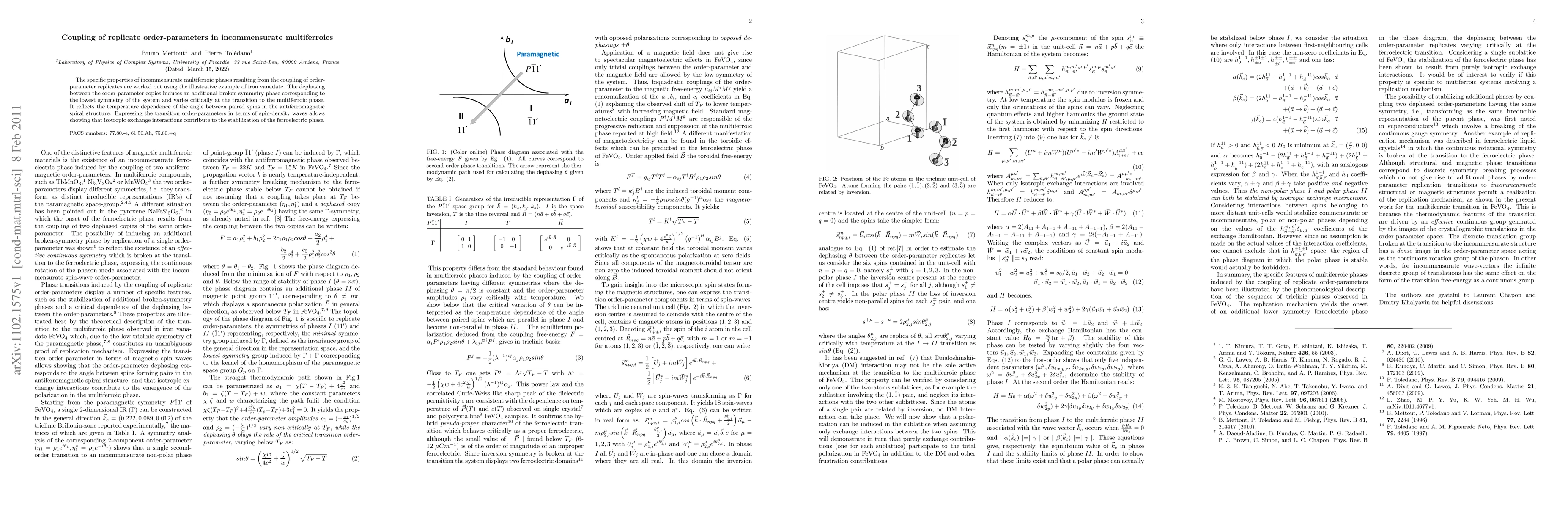 The specific properties of incommensurate multiferroic phases resulting from the coupling of order-parameter replicates are worked out using the illustrative example of iron vanadate. The dephasing between the order-parameter copies induces an additional broken symmetry phase corresponding to the lowest symmetry of the system and varies critically at the transition to the multiferroic phase. It reflects the temperature dependence of the angle between paired spins in the antiferromagnetic spiral structure. Expressing the transition order-parameters in terms of spin-density waves allows showing that isotropic exchange interactions contribute to the stabilization of the ferroelectric phase.