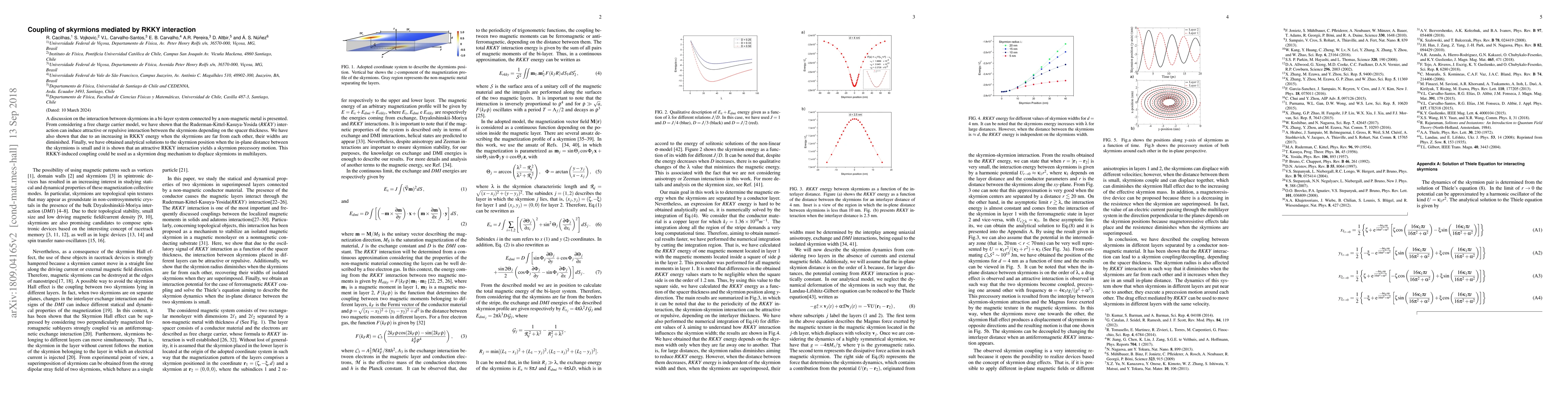 A discussion on the interaction between skyrmions in a bi-layer system connected by a non-magnetic metal is presented. From considering a free charge carrier model, we have shown that the Ruderman-Kittel-Kasuya-Yosida (RKKY ) inter- action can induce attractive or repulsive interaction between the skyrmions depending on the spacer thickness. We have also shown that due to an increasing in RKKY energy when the skyrmions are far from each other, their widths are diminished. Finally, we have obtained analytical solutions to the skyrmion position when the in-plane distance between the skyrmions is small and it is shown that an attractive RKKY interaction yields a skyrmion precessory motion. This RKKY-induced coupling could be used as a skyrmion drag mechanism to displace skyrmions in multilayers.
