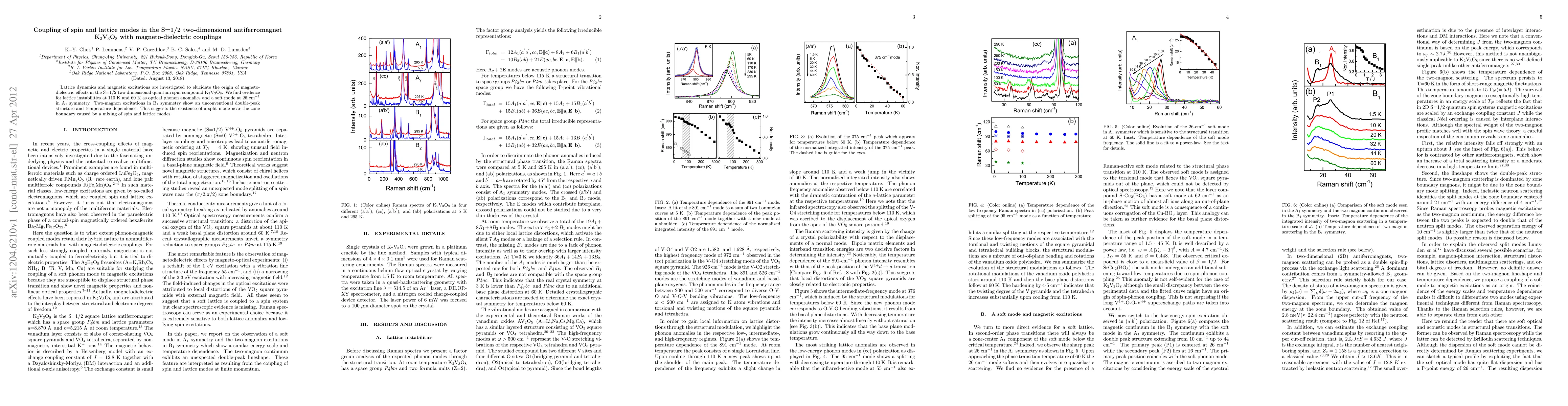 Lattice dynamics and magnetic excitations are investigated to elucidate the origin of magneto-dielectric effects in the S=1/2 two-dimensional quantum spin compound K$_2$V$_3$O$_8$. We find evidence for lattice instabilities at 110 K and 60 K as optical phonon anomalies and a soft mode at 26 cm$^{-1}$ in A$_1$ symmetry. Two-magnon excitations in B$_1$ symmetry show an unconventional double-peak structure and temperature dependence. This suggests the existence of a split mode near the zone boundary caused by a mixing of spin and lattice modes.