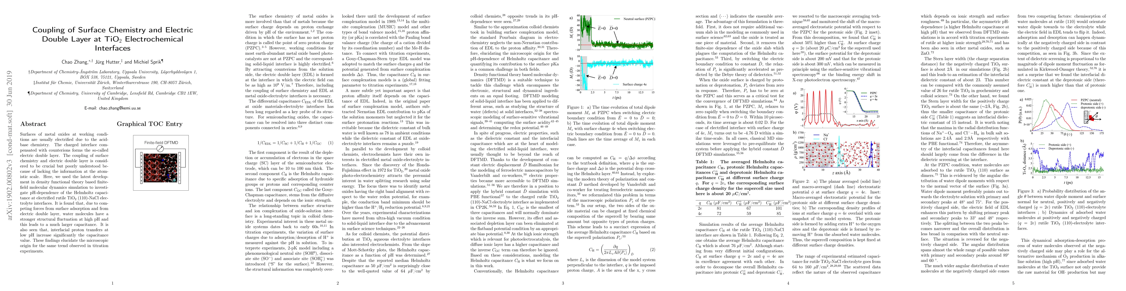 Surfaces of metal oxides at working conditions are usually electrified due to the acid-base chemistry. The charged interface compensated with counterions forms the so-called electric double layer. The coupling of surface chemistry and electric double layer is considered to be crucial but poorly understood because of lacking the information at the atomistic scale. Here, we used the latest development in density functional theory based finite-field molecular dynamics simulation to investigate pH-dependence of the Helmholtz capacitance at electrified rutile TiO$_2$ (110)-NaCl electrolyte interfaces. It is found that, due to competing forces from surface adsorption and from electric double layer, water molecules have a stronger structural fluctuation at high pH and this leads to a much larger capacitance. It is also seen that, interfacial proton transfers at low pH increase significantly the capacitance value. These findings elucidate the microscopic origin for the same trend observed in titration experiments.