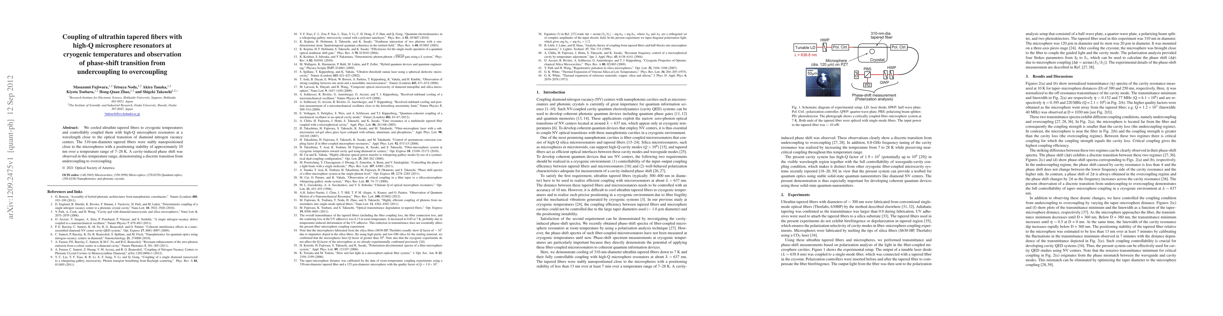 We cooled ultrathin tapered fibers to cryogenic temperatures and controllably coupled them with high-Q microsphere resonators at a wavelength close to the optical transition of diamond nitrogen vacancy centers. The 310-nm-diameter tapered fibers were stably nanopositioned close to the microspheres with a positioning stability of approximately 10 nm over a temperature range of 7-28 K. A cavity-induced phase shift was observed in this temperature range, demonstrating a discrete transition from undercoupling to overcoupling.