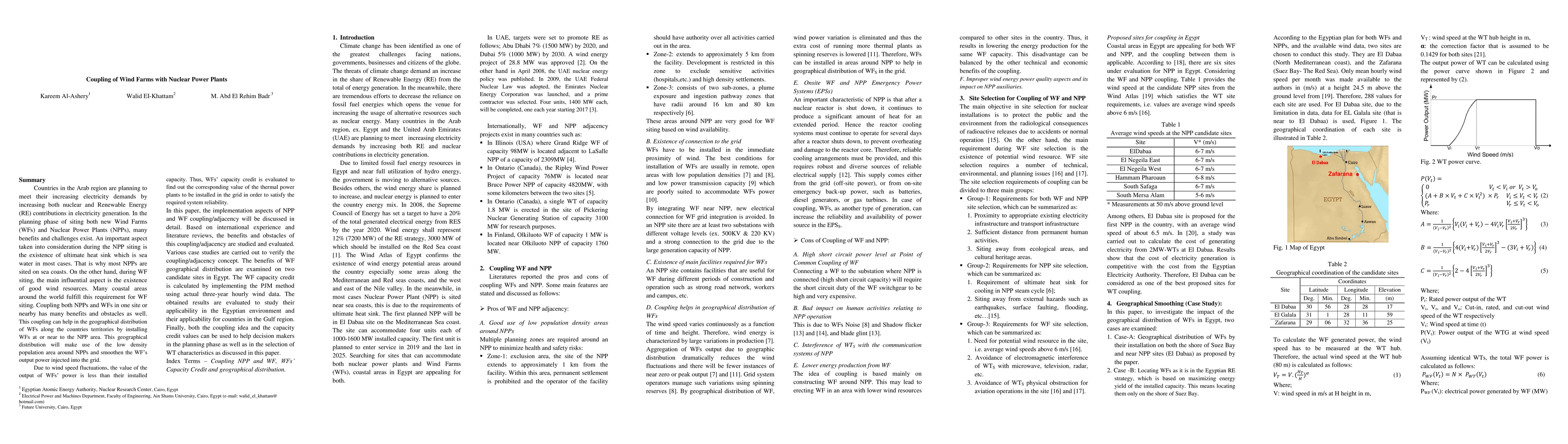 In the planning phase of siting both new Wind Farms (WFs) and Nuclear Power Plants (NPPs), many benefits and challenges exist. An important aspect taken into consideration during the NPP siting is the existence of ultimate heat sink which is sea water in most cases. That is why most NPPs are sited on sea coasts. On the other hand, during WF siting, the main influential aspect is the existence of good wind resources. Many coastal areas around the world fulfill this requirement for WF siting. Coupling both NPPs and WFs in one site or nearby has many benefits and obstacles as well. In this paper, the implementation aspects of NPP and WF coupling/adjacency will be discussed in detail. Based on international experience and literature reviews, the benefits and obstacles of this coupling/adjacency are studied and evaluated. Various case studies are carried out to verify the coupling/adjacency concept. The benefits of WF geographical distribution are examined on two candidate sites in Egypt. The WF capacity credit is calculated by implementing the PJM method using actual three-year hourly wind data. The obtained results are evaluated to study their applicability in the Egyptian environment and their applicability for countries in the Gulf region. Finally, both the coupling idea and the capacity credit values can be used to help decision makers in the planning phase as well as in the selection of WT characteristics as discussed in this paper.