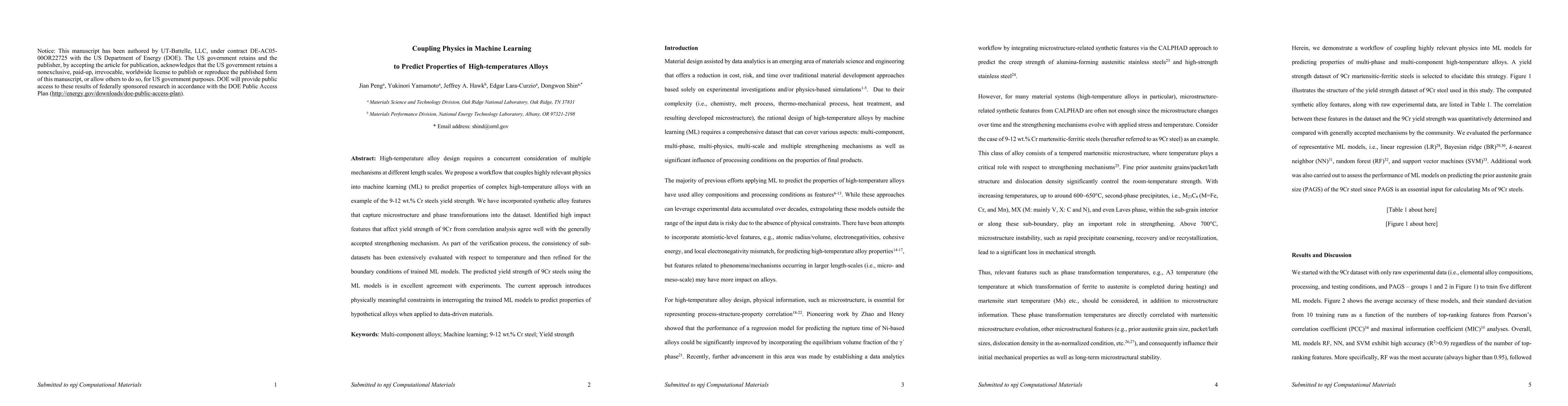 This research proposes a machine learning workflow that integrates physics-based features to predict the yield strength of high-temperature alloys, specifically 9-12 wt.% Cr steels. The approach successfully identifies key microstructure and phase transformation features that align with established strengthening mechanisms, leading to accurate predictions validated by experimental data.