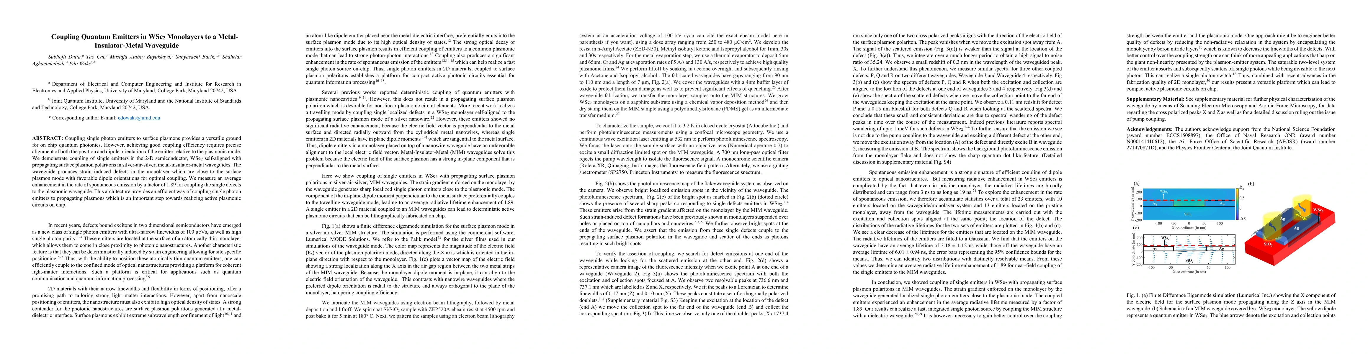 This research demonstrates the efficient coupling of single photon emitters in WSe2 monolayers to surface plasmons guided by metal-insulator-metal waveguides, achieving an average enhancement in emission rate by a factor of 1.89, paving the way for on-chip quantum photonics.