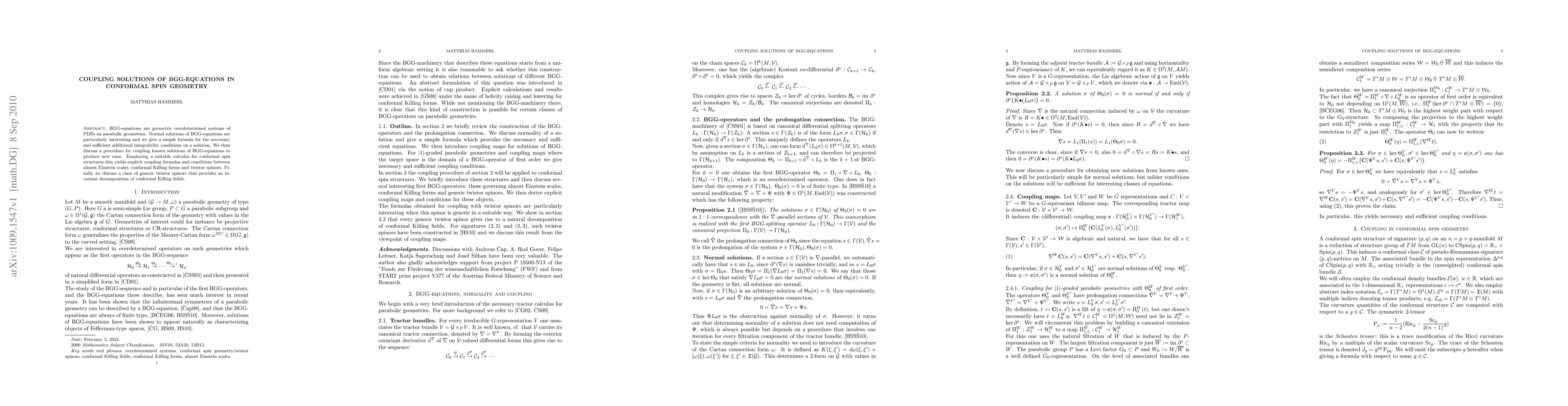 BGG-equations are geometric overdetermined systems of PDEs on parabolic geometries. Normal solutions of BGG-equations are particularly interesting and we give a simple formula for the necessary and sufficient additional integrability conditions on a solution. We then discuss a procedure for coupling known solutions of BGG-equations to produce new ones. Employing a suitable calculus for conformal spin structures this yields explicit coupling formulas and conditions between almost Einstein scales, conformal Killing forms and twistor spinors. Finally we discuss a class of generic twistor spinors that provides an invariant decomposition of conformal Killing fields.