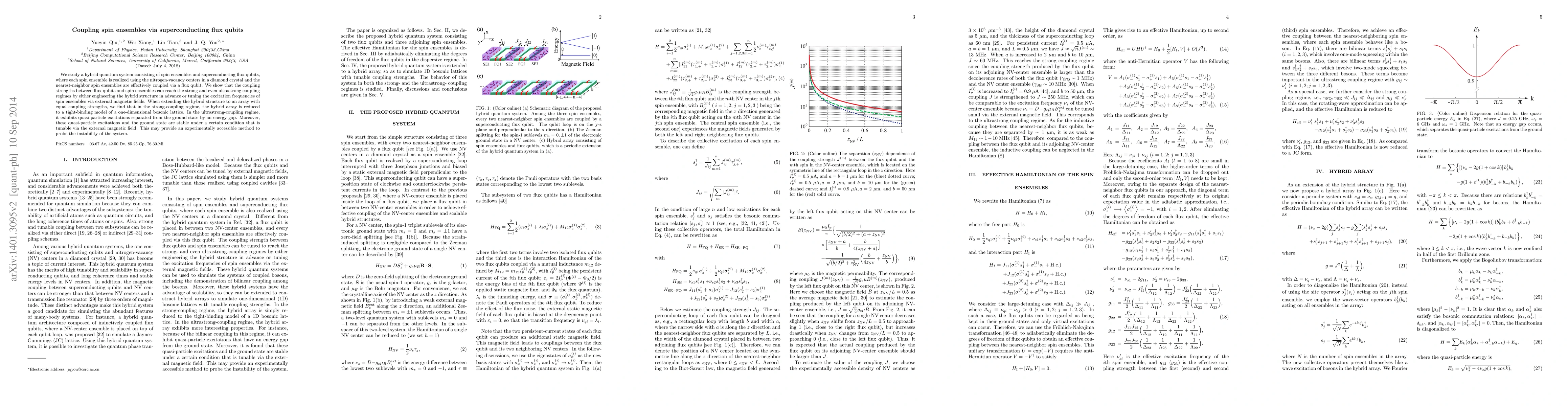 This research investigates a hybrid quantum system coupling spin ensembles in nitrogen-vacancy centers with superconducting flux qubits, achieving strong and ultrastrong coupling regimes. The study reveals that the hybrid array in strong coupling behaves like a one-dimensional bosonic lattice, while in ultrastrong coupling, it shows quasiparticle excitations with tunable stability via external magnetic fields.