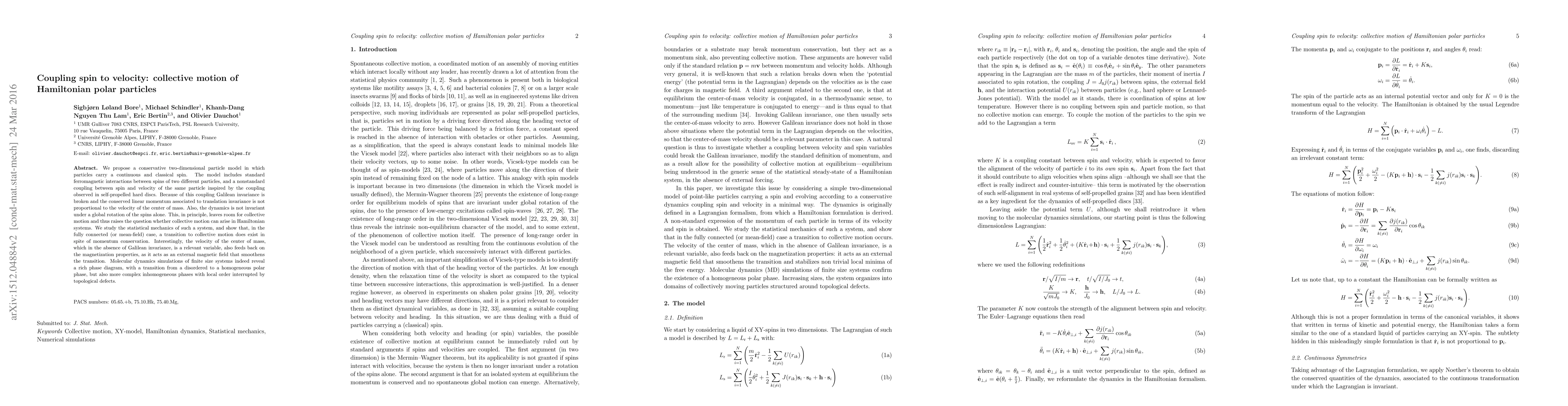 This paper proposes a two-dimensional particle model with spin-velocity coupling, breaking Galilean invariance, and explores its statistical mechanics. It finds that despite momentum conservation, a transition to collective motion occurs, revealing a rich phase diagram with various ordered and disordered phases.