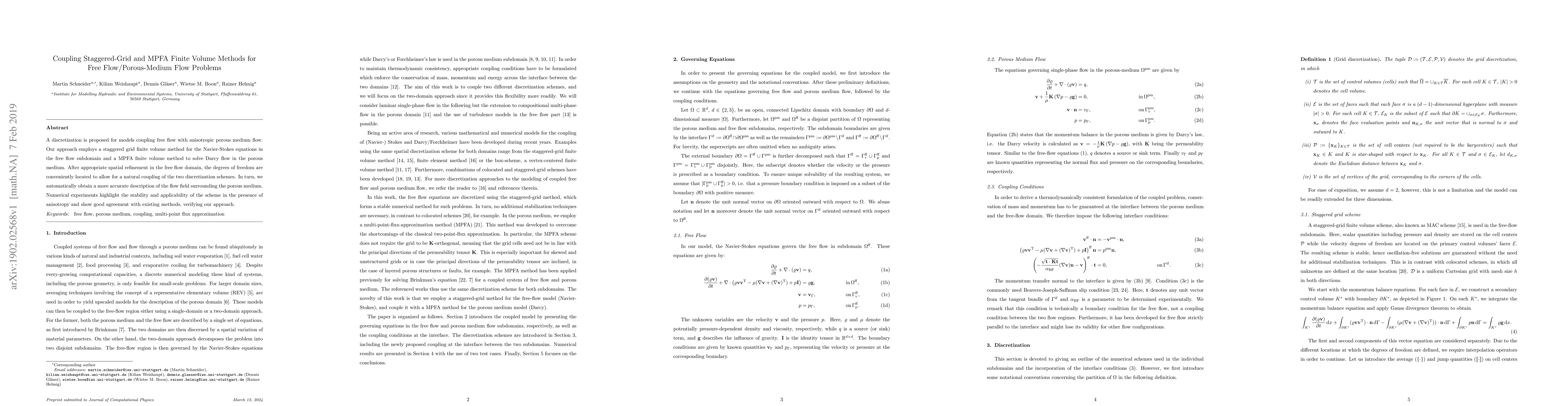 This paper proposes a coupled staggered-grid and MPFA finite volume method for simulating free flow and anisotropic porous medium flow. The method combines a staggered grid for the Navier-Stokes equations and a MPFA method for Darcy flow, achieving a stable and accurate representation of the flow field, as verified by numerical experiments.