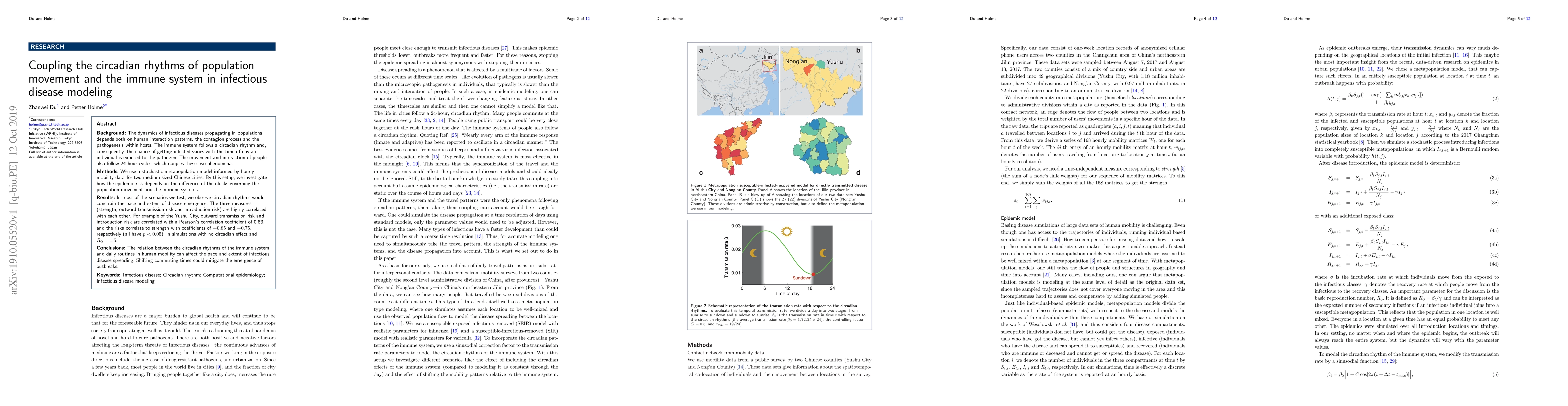The dynamics of infectious diseases propagating in populations depends both on human interaction patterns, the contagion process and the pathogenesis within hosts. The immune system follows a circadian rhythm and, consequently, the chance of getting infected varies with the time of day an individual is exposed to the pathogen. The movement and interaction of people also follow 24-hour cycles, which couples these two phenomena. We use a stochastic metapopulation model informed by hourly mobility data for two medium-sized Chinese cities. By this setup, we investigate how the epidemic risk depends on the difference of the clocks governing the population movement and the immune systems. In most of the scenarios we test, we observe circadian rhythms would constrain the pace and extent of disease emergence. The three measures (strength, outward transmission risk and introduction risk) are highly correlated with each other. For example of the Yushu City, outward transmission risk and introduction risk are correlated with a Pearson's correlation coefficient of 0.83, and the risks correlate to strength with coefficients of $-0.85$ and $-0.75$, respectively (all have $p<0.05$), in simulations with no circadian effect and $R_0=1.5$. The relation between the circadian rhythms of the immune system and daily routines in human mobility can affect the pace and extent of infectious disease spreading. Shifting commuting times could mitigate the emergence of outbreaks.