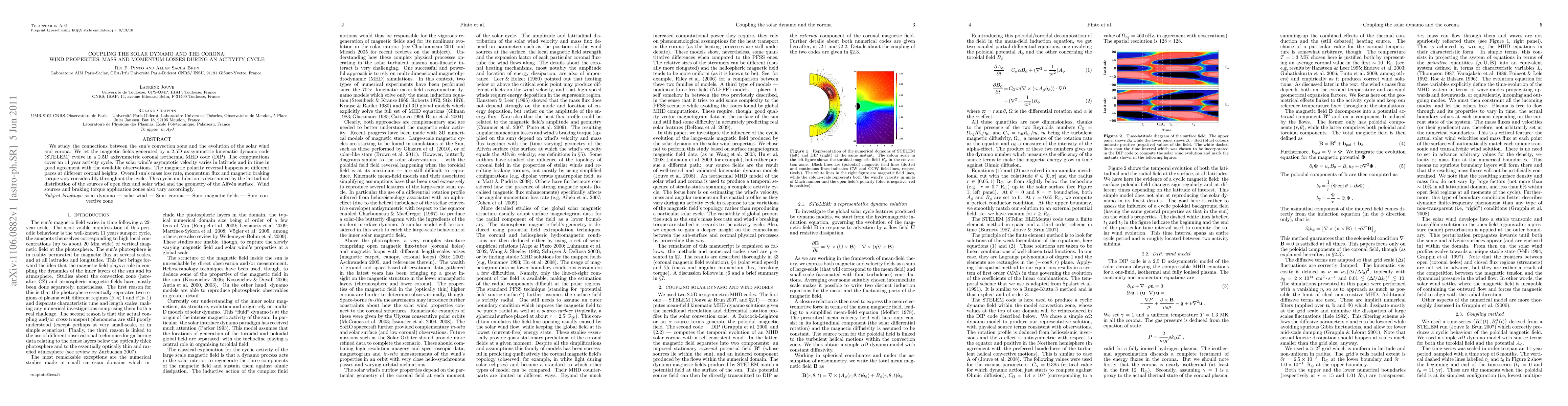We study the connections between the sun's convection zone and the evolution of the solar wind and corona. We let the magnetic fields generated by a 2.5D axisymmetric kinematic dynamo code (STELEM) evolve in a 2.5D axisymmetric coronal isothermal MHD code (DIP). The computations cover an 11 year activity cycle. The solar wind's asymptotic velocity varies in latitude and in time in good agreement with the available observations. The magnetic polarity reversal happens at different paces at different coronal heights. Overall sun's mass loss rate, momentum flux and magnetic braking torque vary considerably throughout the cycle. This cyclic modulation is determined by the latitudinal distribution of the sources of open flux and solar wind and the geometry of the Alfv\'en surface. Wind sources and braking torque application zones also vary accordingly.