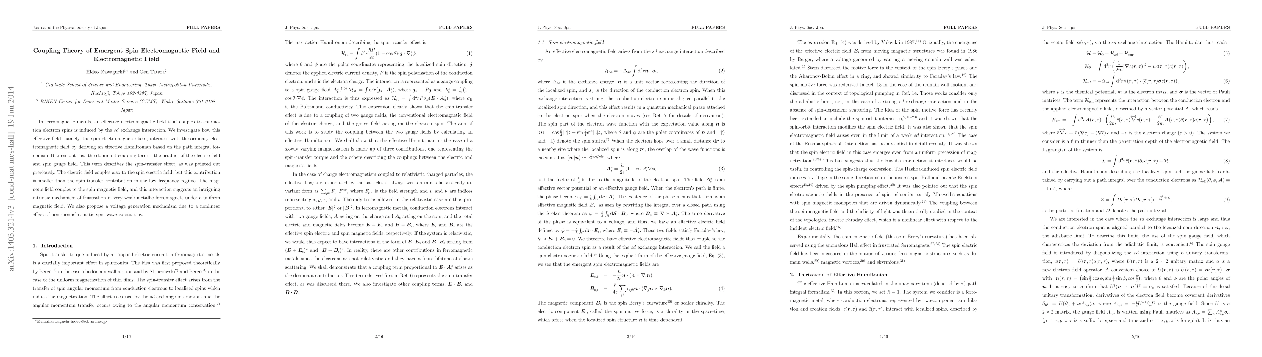 Researchers investigate how an effective electromagnetic field in ferromagnetic metals interacts with ordinary electromagnetic fields, revealing a key coupling term that describes the spin-transfer effect. This discovery suggests new mechanisms for frustration in weak metallic ferromagnets and voltage generation due to non-linear spin wave excitation.