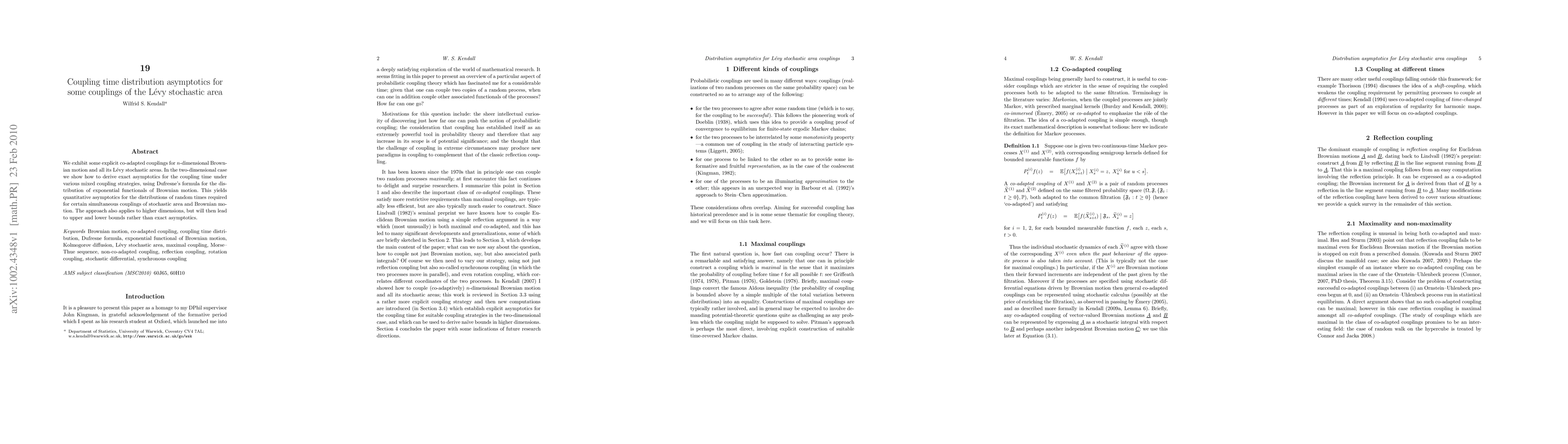 This paper presents explicit co-adapted couplings for n-dimensional Brownian motion and its Lévy stochastic areas, deriving exact asymptotics for the coupling time in two dimensions using Dufresne's formula for exponential functionals. The approach provides quantitative asymptotics for coupling times in lower dimensions and bounds in higher dimensions.