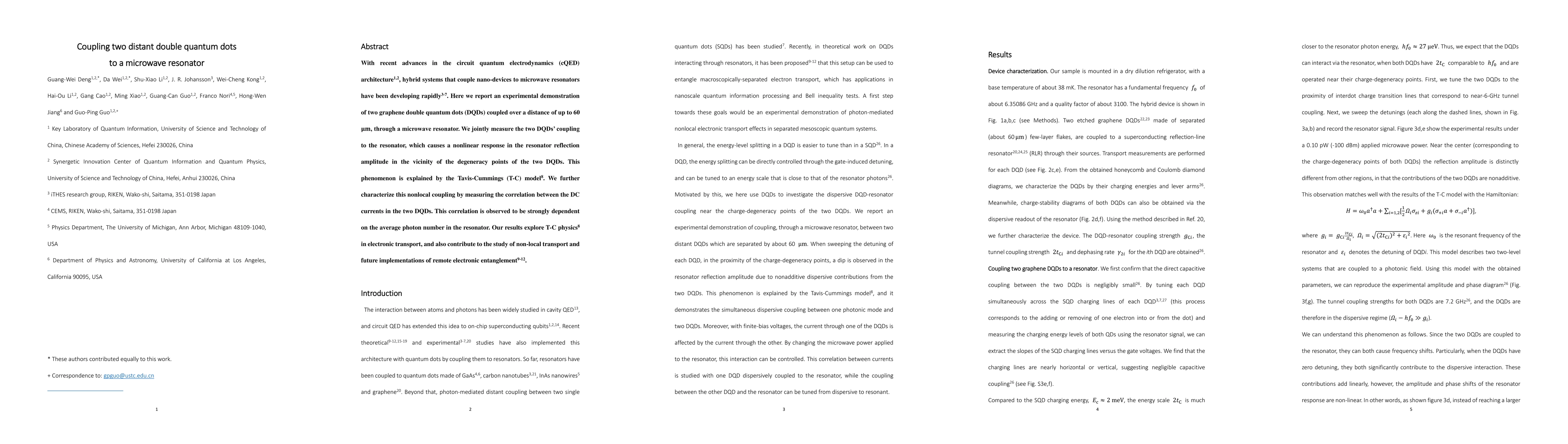 This research demonstrates the coupling of two spatially separated graphene double quantum dots (DQDs) via a microwave resonator, showing a nonlinear response in the resonator's reflection amplitude near the DQDs' degeneracy points, explained by the Tavis-Cummings model. The study also measures the correlation between the DQDs' DC currents, revealing its dependence on the resonator's average photon number, contributing to nonlocal transport and potential remote electronic entanglement applications.