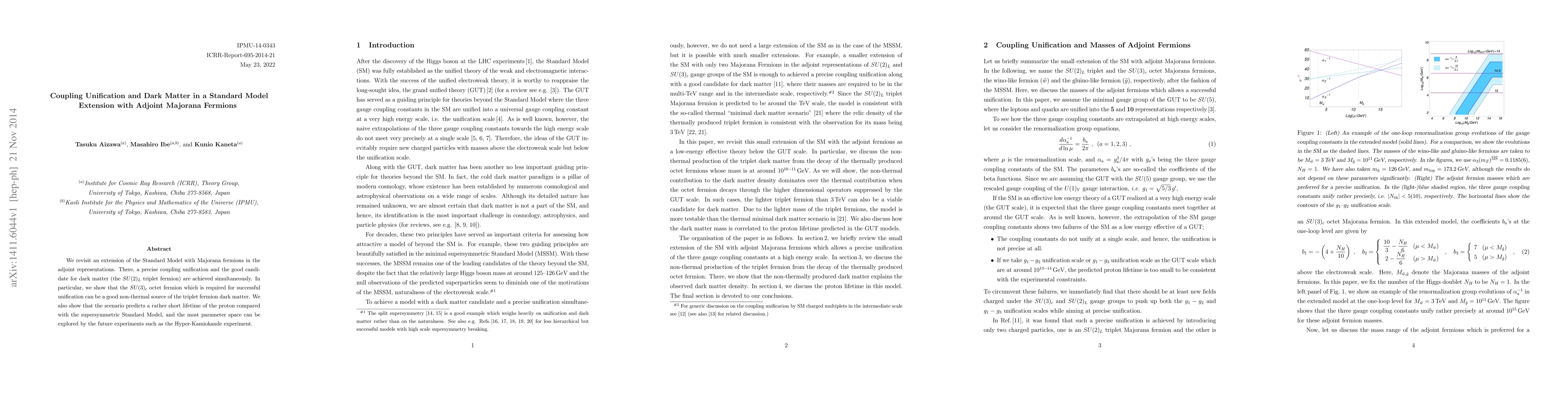 This paper proposes an extension of the Standard Model incorporating adjoint Majorana fermions, achieving precise coupling unification and identifying a viable dark matter candidate. The $SU(3)_c$ octet fermion is suggested as a non-thermal source for the triplet fermion dark matter, and the model predicts a shorter proton lifetime than in supersymmetric models, with future experiments like Hyper-Kamiokande potentially probing most of its parameter space.
