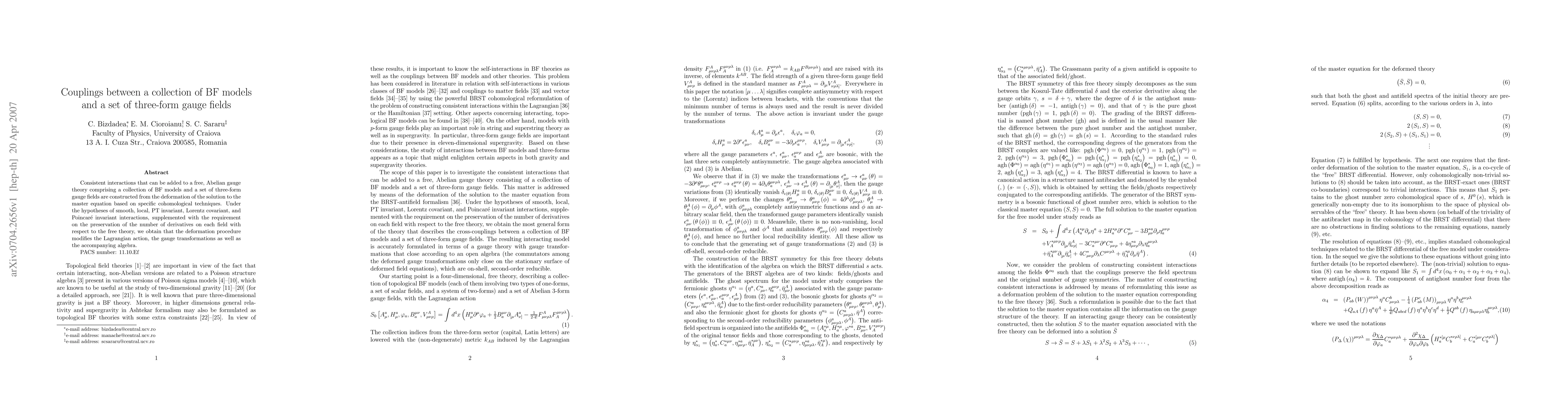 Consistent interactions that can be added to a free, Abelian gauge theory comprising a collection of BF models and a set of three-form gauge fields are constructed from the deformation of the solution to the master equation based on specific cohomological techniques. Under the hypotheses of smooth, local, PT invariant, Lorentz covariant, and Poincare invariant interactions, supplemented with the requirement on the preservation of the number of derivatives on each field with respect to the free theory, we obtain that the deformation procedure modifies the Lagrangian action, the gauge transformations as well as the accompanying algebra.