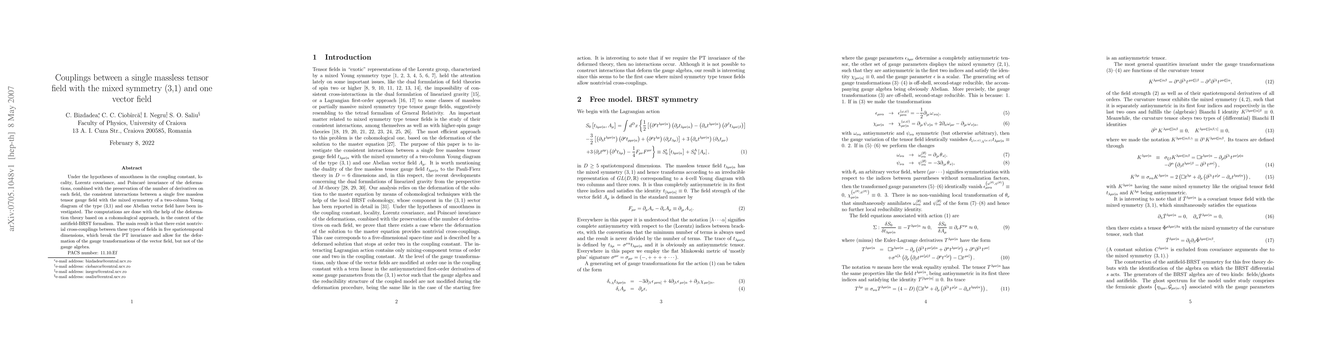 Under the hypotheses of smoothness in the coupling constant, locality, Lorentz covariance, and Poincare invariance of the deformations, combined with the preservation of the number of derivatives on each field, the consistent interactions between a single free massless tensor gauge field with the mixed symmetry of a two-column Young diagram of the type (3,1) and one Abelian vector field have been investigated. The computations are done with the help of the deformation theory based on a cohomological approach, in the context of the antifield-BRST formalism. The main result is that there exist nontrivial cross-couplings between these types of fields in five spatiotemporal dimensions, which break the PT invariance and allow for the deformation of the gauge transformations of the vector field, but not of the gauge algebra.