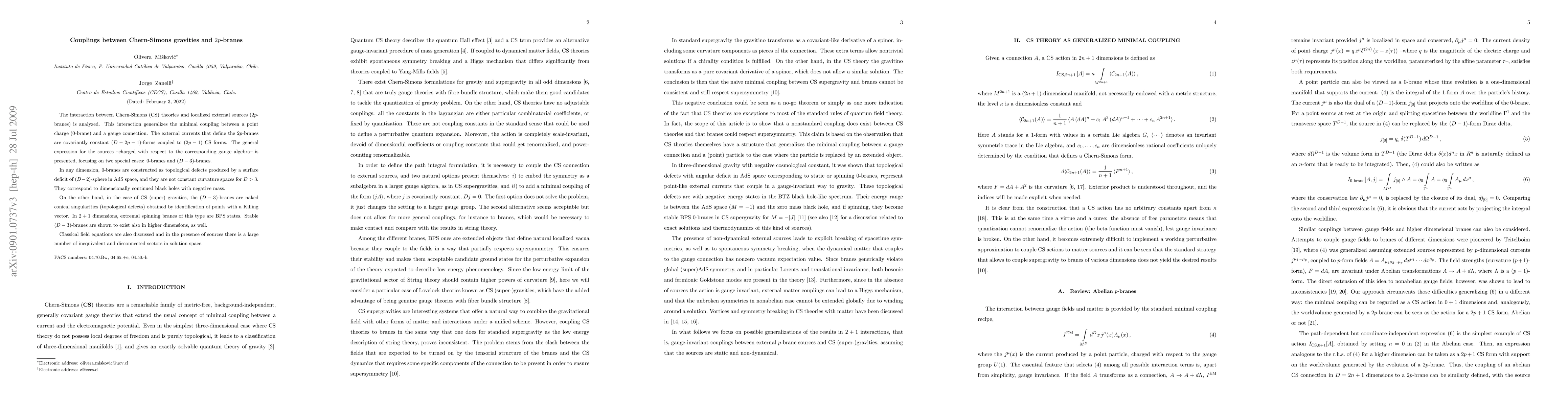 This paper analyzes the interaction between Chern-Simons theories and 2p-branes, generalizing minimal coupling between point charges and gauge connections. It presents a general expression for the sources coupled to gauge algebras, focusing on 0-branes and (D-3)-branes, and discusses the classical field equations in the presence of these sources.