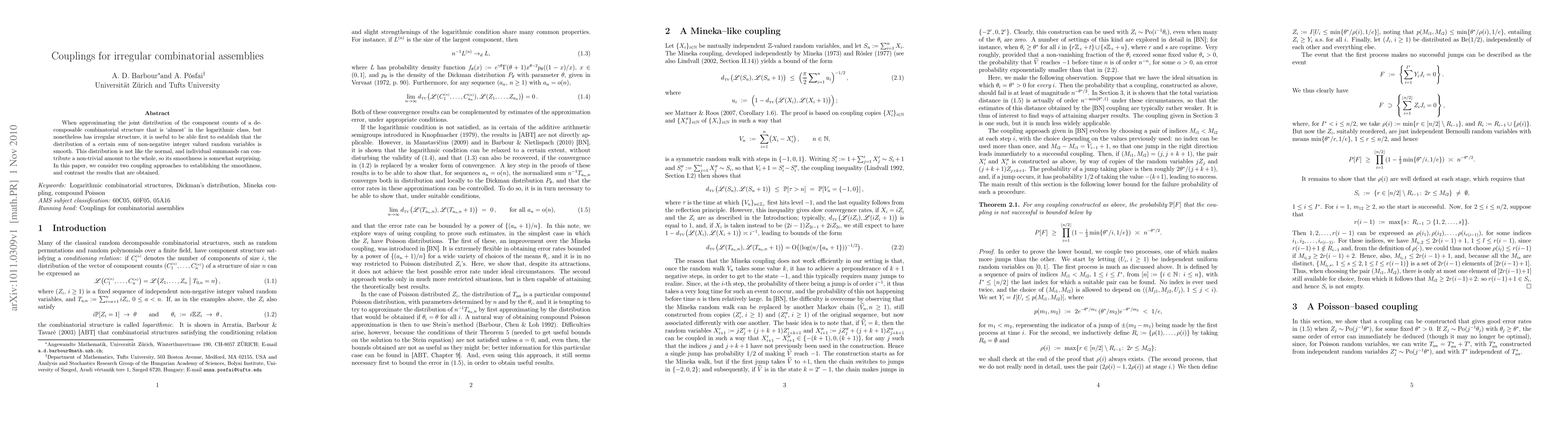 When approximating the joint distribution of the component counts of a decomposable combinatorial structure that is `almost' in the logarithmic class, but nonetheless has irregular structure, it is useful to be able first to establish that the distribution of a certain sum of non-negative integer valued random variables is smooth. This distribution is not like the normal, and individual summands can contribute a non-trivial amount to the whole, so its smoothness is somewhat surprising. In this paper, we consider two coupling approaches to establishing the smoothness, and contrast the results that are obtained.