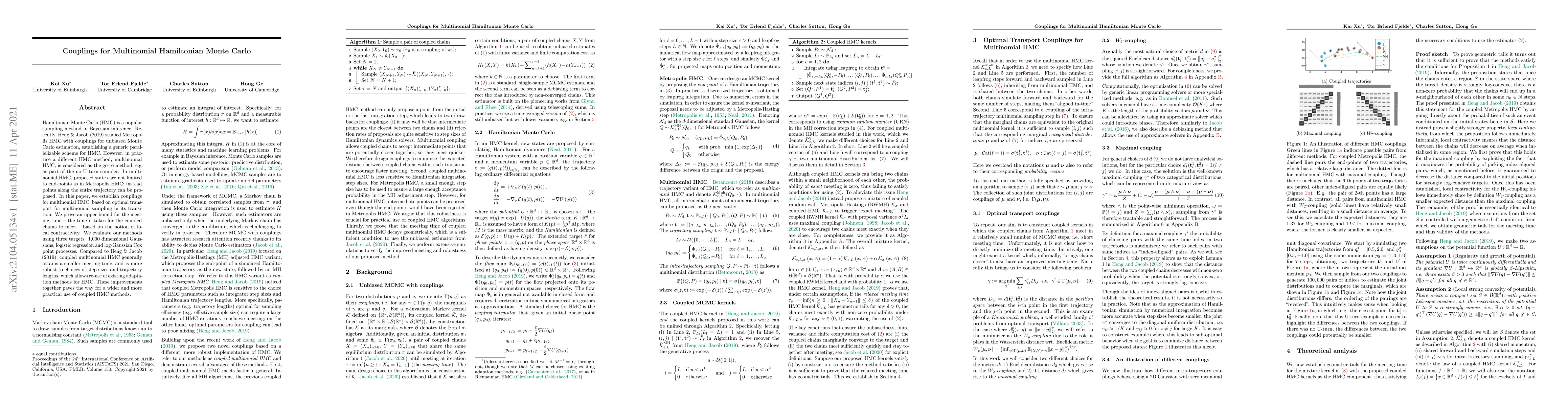 Hamiltonian Monte Carlo (HMC) is a popular sampling method in Bayesian inference. Recently, Heng & Jacob (2019) studied Metropolis HMC with couplings for unbiased Monte Carlo estimation, establishing a generic parallelizable scheme for HMC. However, in practice a different HMC method, multinomial HMC, is considered as the go-to method, e.g. as part of the no-U-turn sampler. In multinomial HMC, proposed states are not limited to end-points as in Metropolis HMC; instead points along the entire trajectory can be proposed. In this paper, we establish couplings for multinomial HMC, based on optimal transport for multinomial sampling in its transition. We prove an upper bound for the meeting time - the time it takes for the coupled chains to meet - based on the notion of local contractivity. We evaluate our methods using three targets: 1,000 dimensional Gaussians, logistic regression and log-Gaussian Cox point processes. Compared to Heng & Jacob (2019), coupled multinomial HMC generally attains a smaller meeting time, and is more robust to choices of step sizes and trajectory lengths, which allows re-use of existing adaptation methods for HMC. These improvements together paves the way for a wider and more practical use of coupled HMC methods.