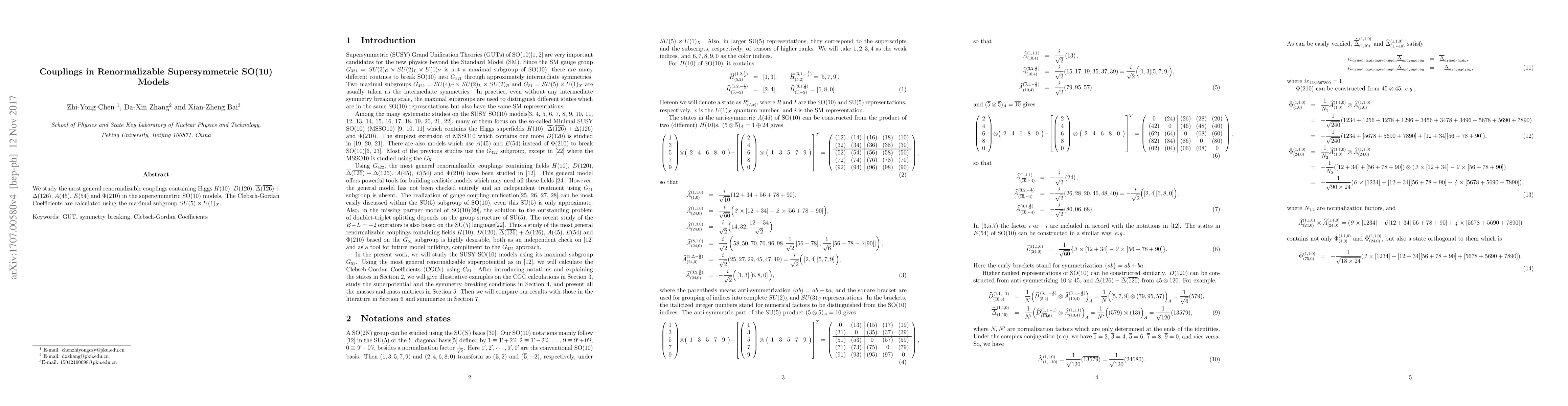 This paper explores the most general renormalizable couplings in supersymmetric SO(10) models, focusing on Higgs representations $H(10)$, $D(120)$, $\overline{\Delta}(\overline{126}) + \Delta(126)$, $A(45)$, $E(54)$, and $\Phi(210)$, and employs Clebsch-Gordan coefficients via the $SU(5)\times U(1)_X$ subgroup for calculations.