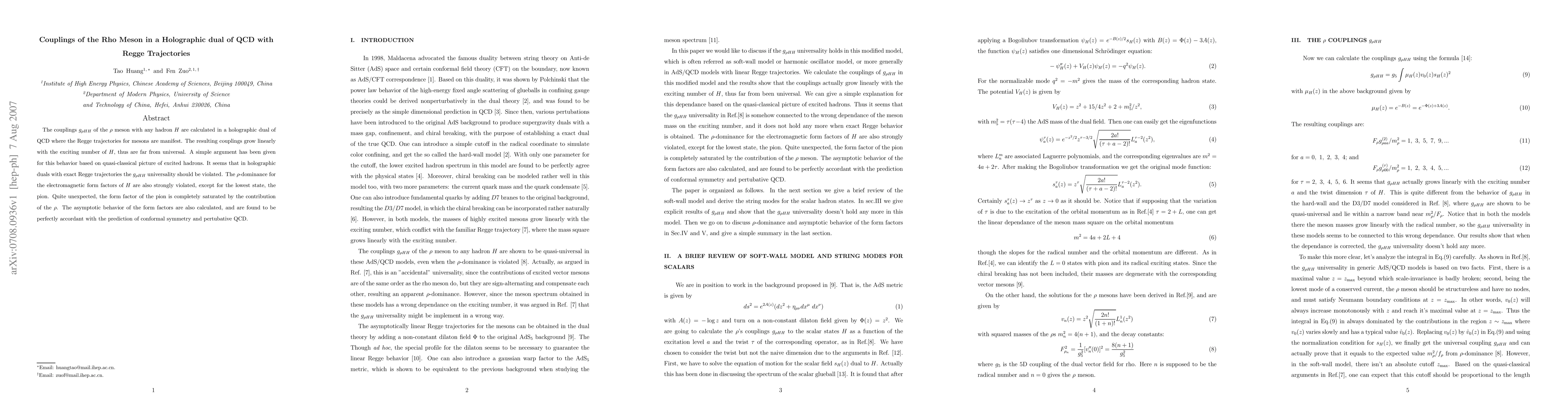 The couplings $g_{\rho HH}$ of the $\rho$ meson with any hadron H are calculated in a holographic dual of QCD where the Regge trajectories for mesons are manifest. The resulting couplings grow linearly with the exciting number of H, thus are far from universal. A simple argument has been given for this behavior based on quasi-classical picture of excited hadrons. It seems that in holographic duals with exact Regge trajectories the $g_{\rho HH}$ universality should be violated. The $\rho$-dominance for the electromagnetic form factors of H are also strongly violated, except for the lowest state, the pion. Quite unexpected, the form factor of the pion is completely saturated by the contribution of the $\rho$. The asymptotic behavior of the form factors are also calculated, and are found to be perfectly accordant with the prediction of conformal symmetry and pertubative QCD.