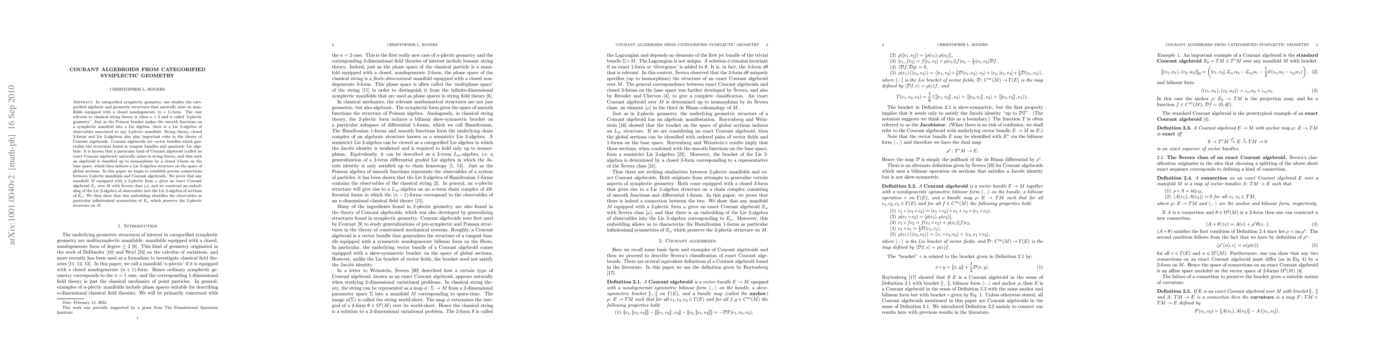 In categorified symplectic geometry, one studies the categorified algebraic and geometric structures that naturally arise on manifolds equipped with a closed nondegenerate (n+1)-form. The case relevant to classical string theory is when n=2 and is called "2-plectic geometry". Just as the Poisson bracket makes the smooth functions on a symplectic manifold into a Lie algebra, there is a Lie 2-algebra of observables associated to any 2-plectic manifold. String theory, closed 3-forms and Lie 2-algebras also play important roles in the theory of Courant algebroids. Courant algebroids are vector bundles which generalize the structures found in tangent bundles and quadratic Lie algebras. It is known that a particular kind of Courant algebroid (called an exact Courant algebroid) naturally arises in string theory, and that such an algebroid is classified up to isomorphism by a closed 3-form on the base space, which then induces a Lie 2-algebra structure on the space of global sections. In this paper we begin to establish precise connections between 2-plectic manifolds and Courant algebroids. We prove that any manifold M equipped with a 2-plectic form omega gives an exact Courant algebroid E_omega over M with Severa class [omega], and we construct an embedding of the Lie 2-algebra of observables into the Lie 2-algebra of sections of E_omega. We then show that this embedding identifies the observables as particular infinitesimal symmetries of E_omega which preserve the 2-plectic structure on M.